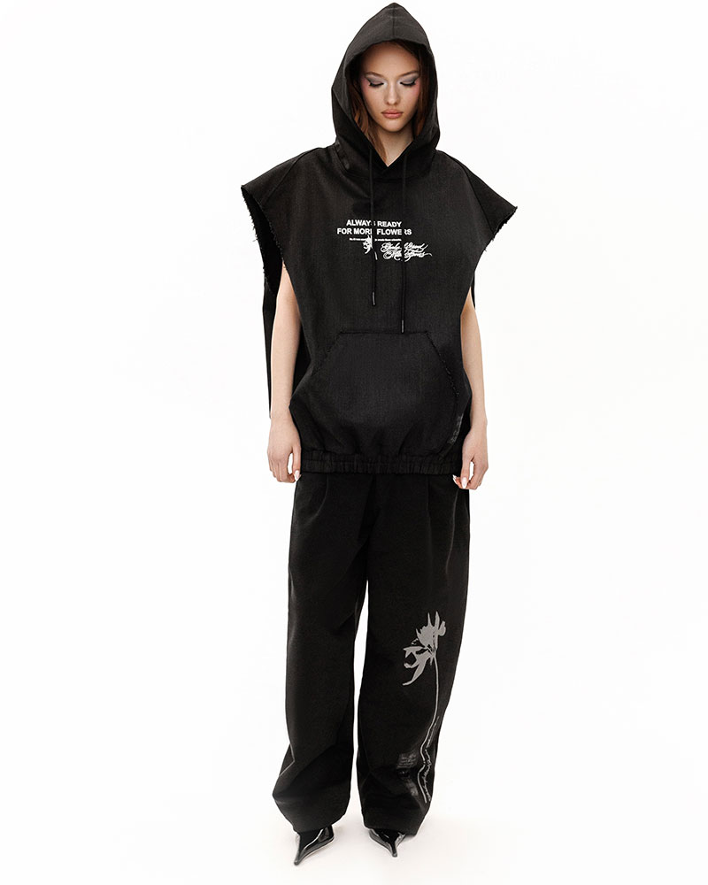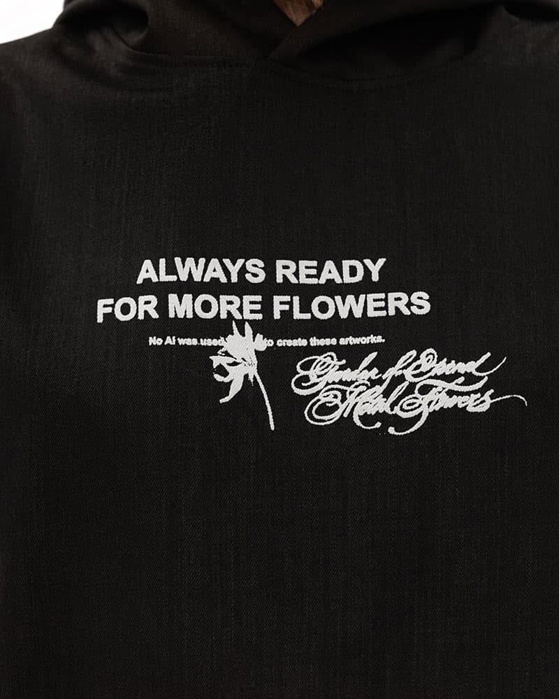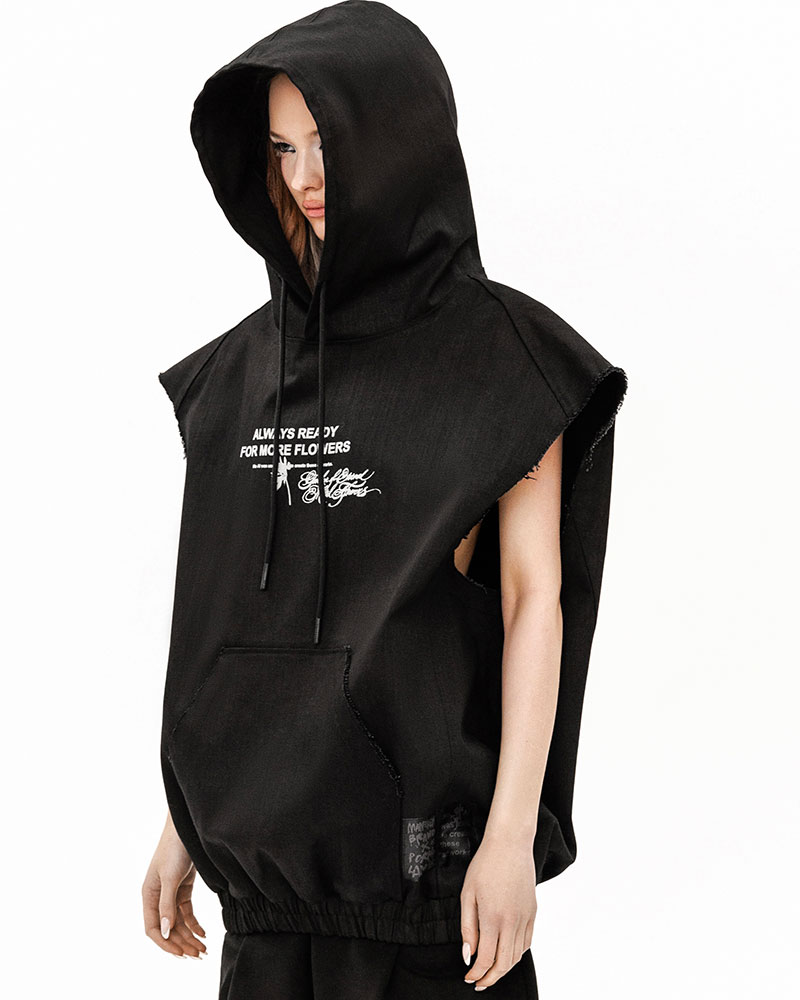 Худи-жилет с капюшоном из денима — футуристичный арт рукотворного искусства, созданный в коллаборации POKRAS LAMPAS ╳ MANEKEN BRAND под названием ALWAYS READY FOR MORE FLOWERS.