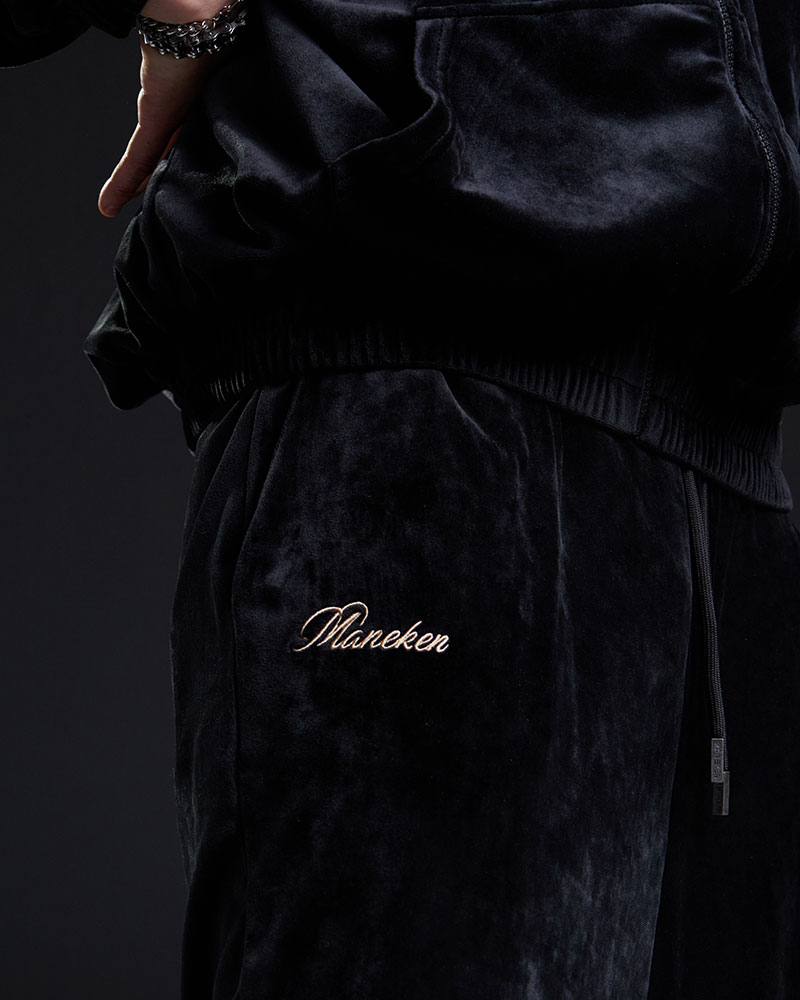 Комплект состоит из худи с молнией и брюк из мягкой бархотной ткани, даря комфортный домашний аутфит с лаконичным, но выразительным стилем.