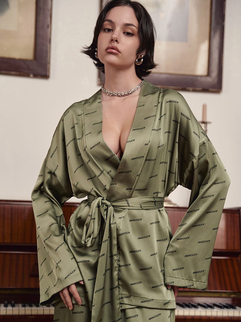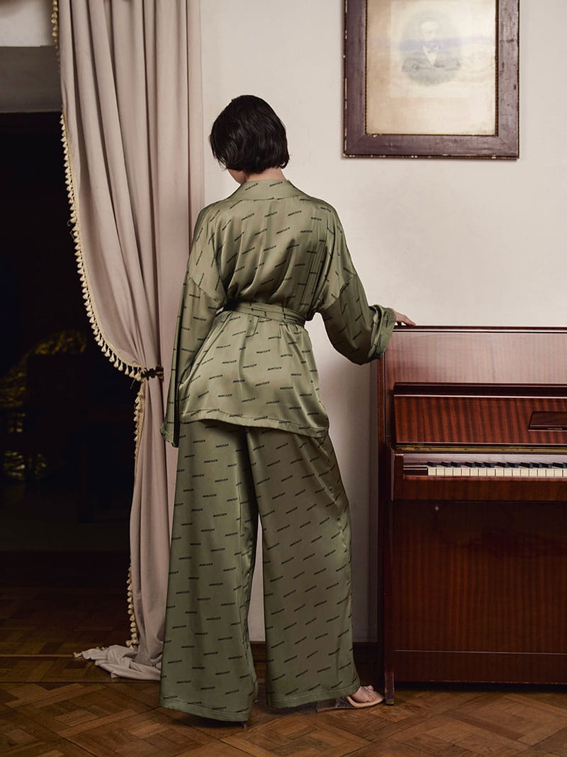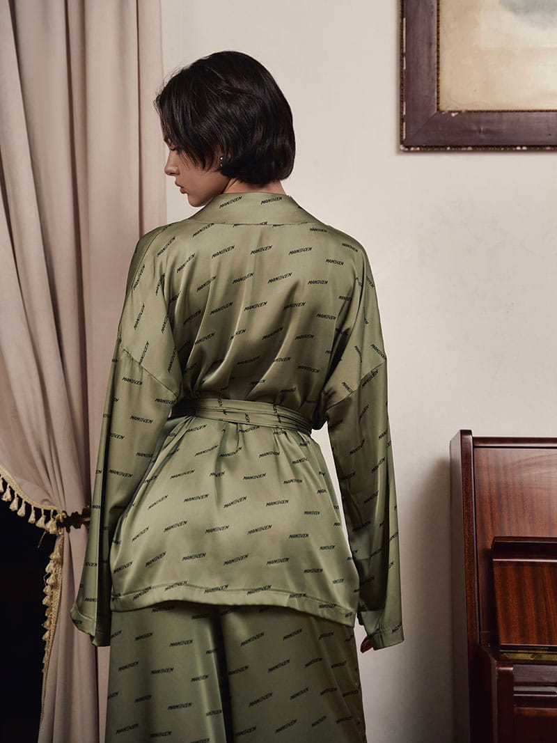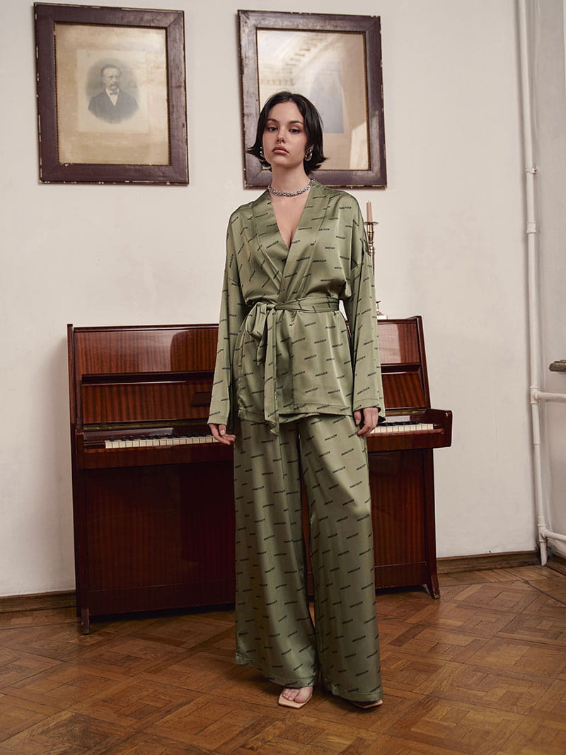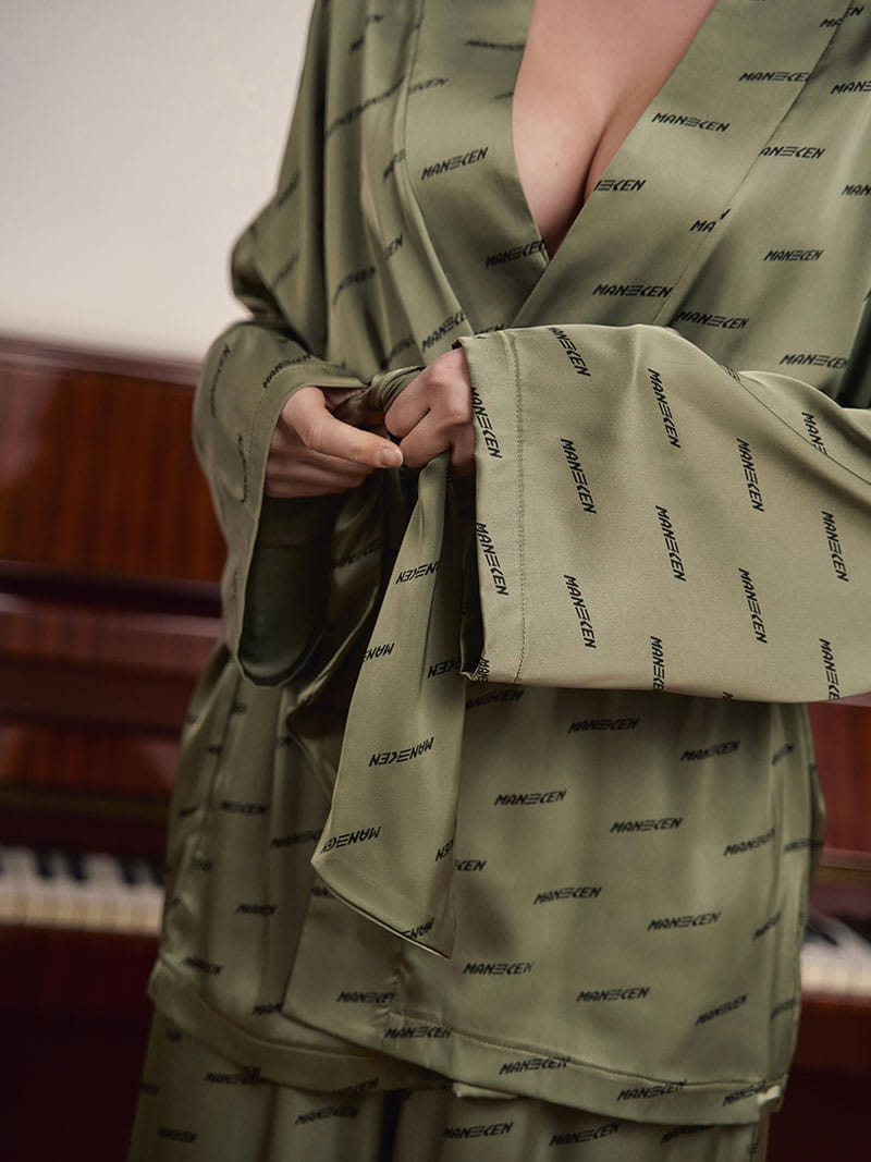 Брендированный костюм из шелка, скользящий по коже, с принтом “Maneken” с эффектом градиента, с переливами на солнце.