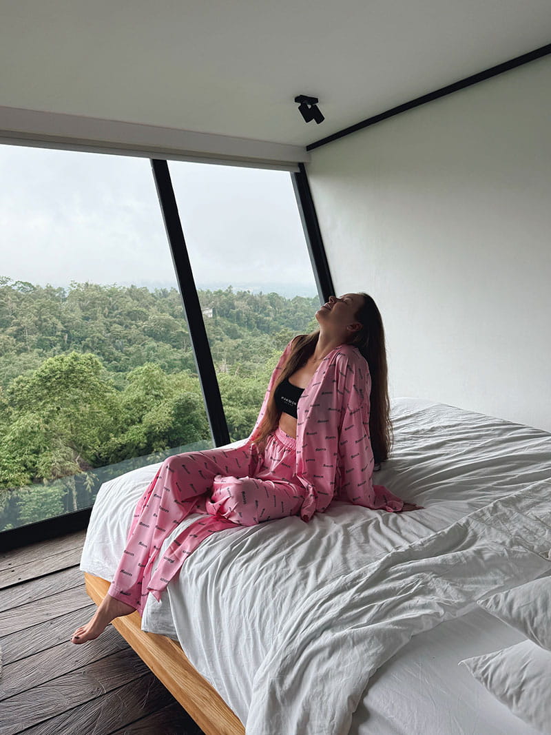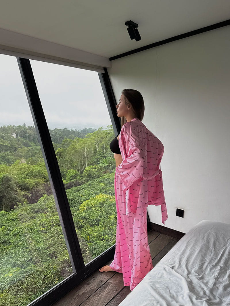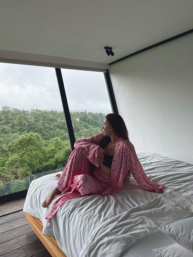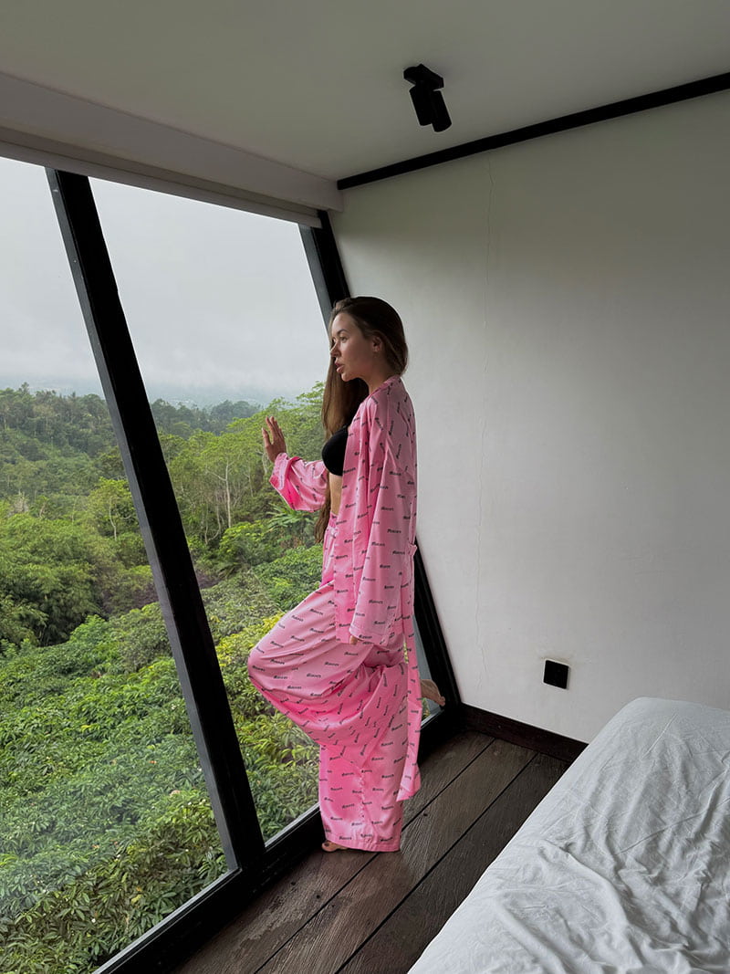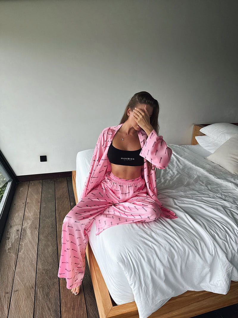 Брендированный костюм из шелка, скользящий по коже, с принтом “Maneken” с эффектом градиента, с переливами на солнце.