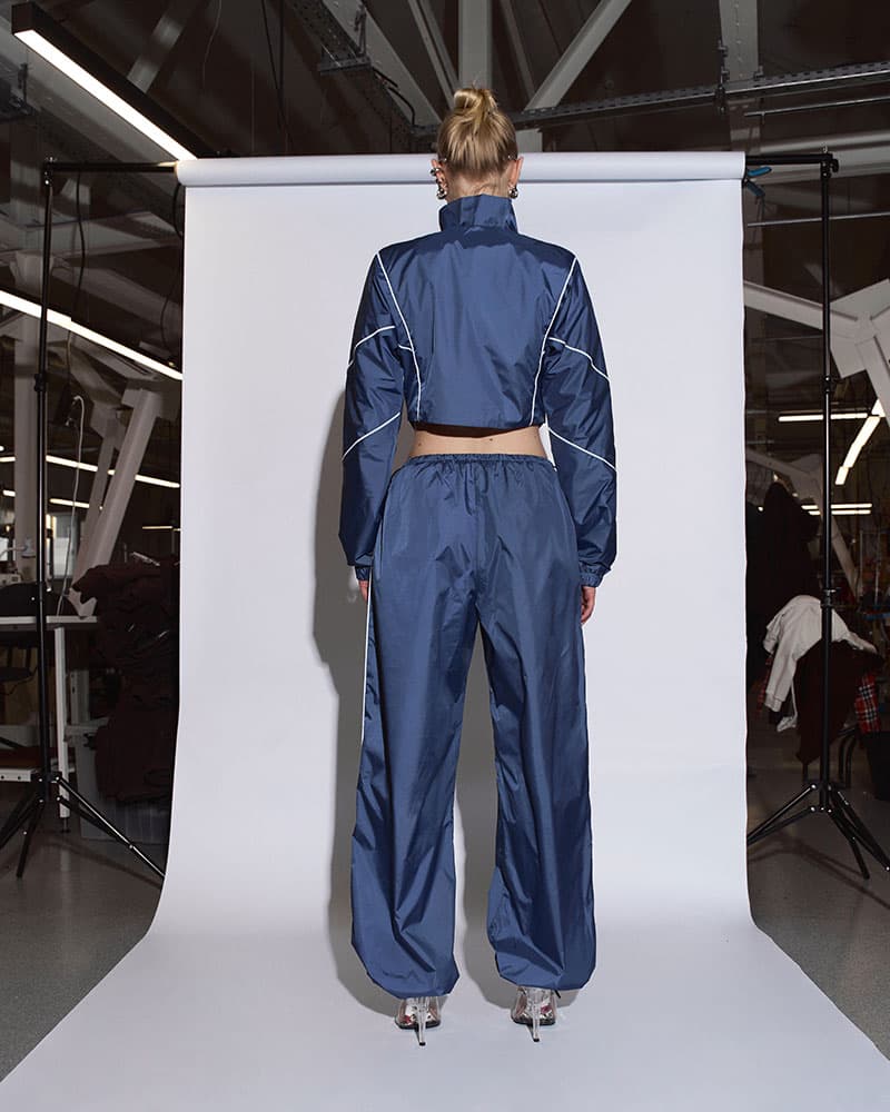 По низу брюк так же имеется резинка с фиксатор для регулирования объёма и силуэта брюк. В боковых швах имеется контрастный кант и наклонные боковые карманы. У кармана нанесён наш фирменный резиновый логотип.