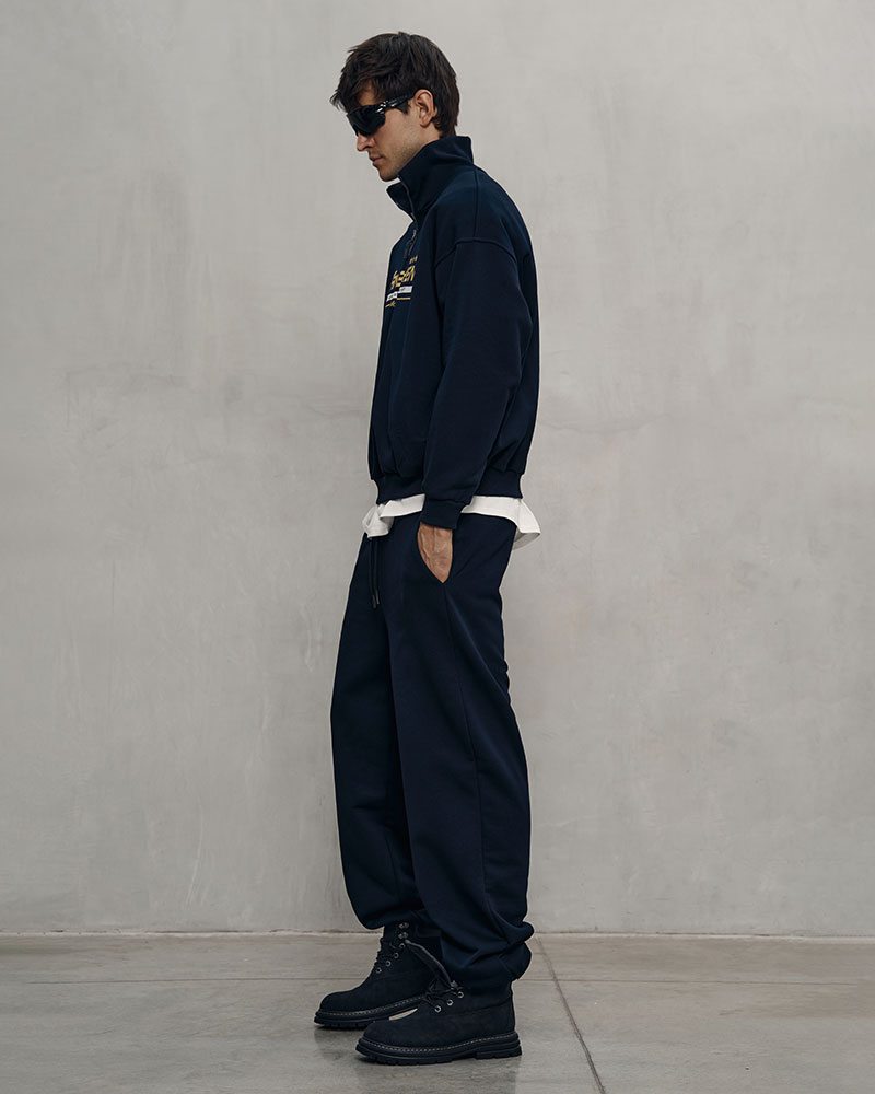 Мужской костюм из мягкого футера — это сочетание уюта, стиля и функциональности. Он состоит из тройера и свободных брюк на узком поясе со шнурками, создавая идеальный баланс между спортивной эстетикой и повседневной элегантностью.