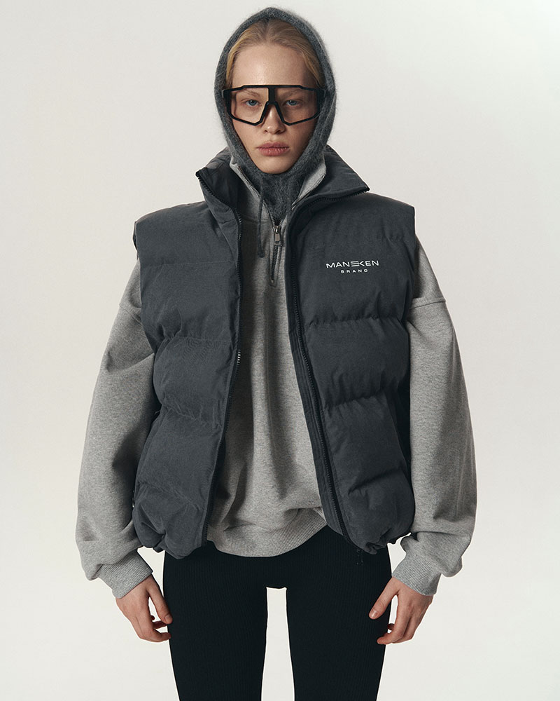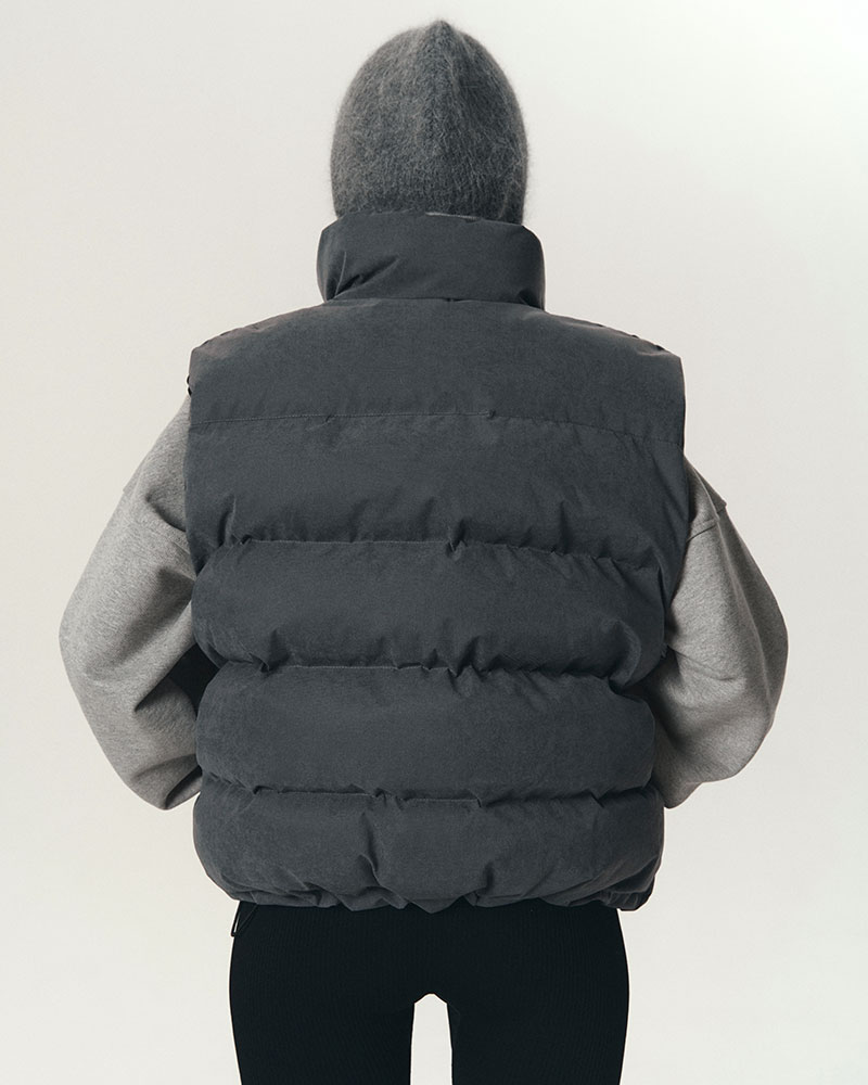 Объёмная удлинённая жилетка со стойкой. Внешняя сторона изделия с пич-эффектом.