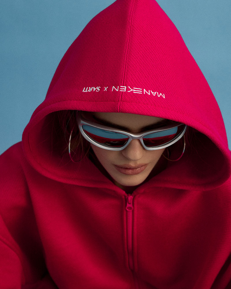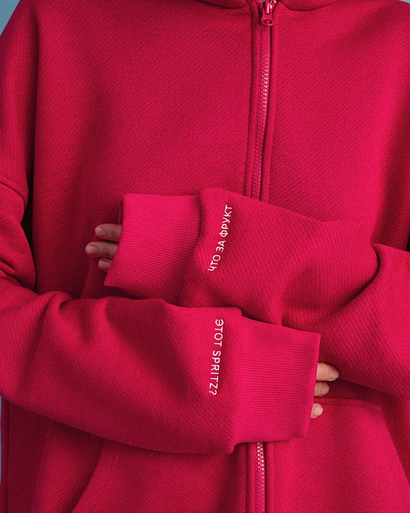 Худи изготовлен из мягкого хлопкового футера в сочном цвете подчеркивающий стиль коллаборации.