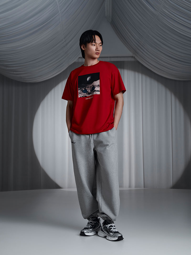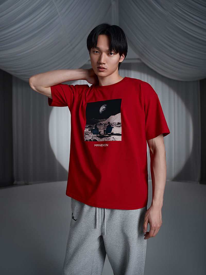 Модель умеренного объёма выполнена в насыщенном ярко-красном оттенке — энергичном, притягивающем внимание с первого взгляда. На этом выразительном фоне особенно четко раскрывается авторский принт: двое наблюдателей с Луны смотрят на Землю, зависшую в бескрайнем чёрном пространстве, усыпанном звёздами.