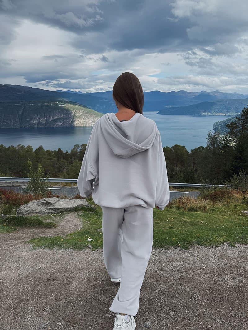 Костюм состоит из oversize худи на молнии и свободных брюк. Выполнен из мягкого велюрового «пич» материала с варёным эффектом.