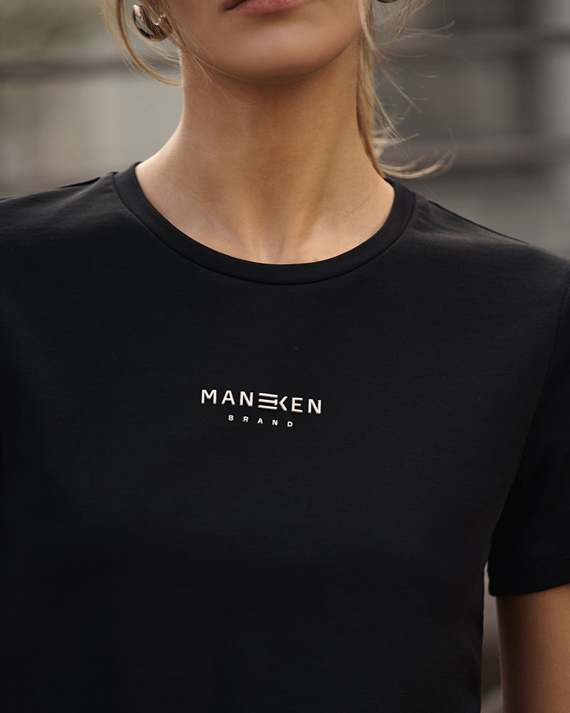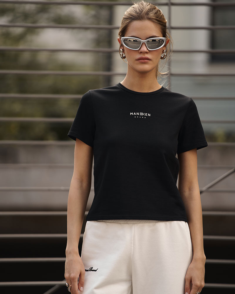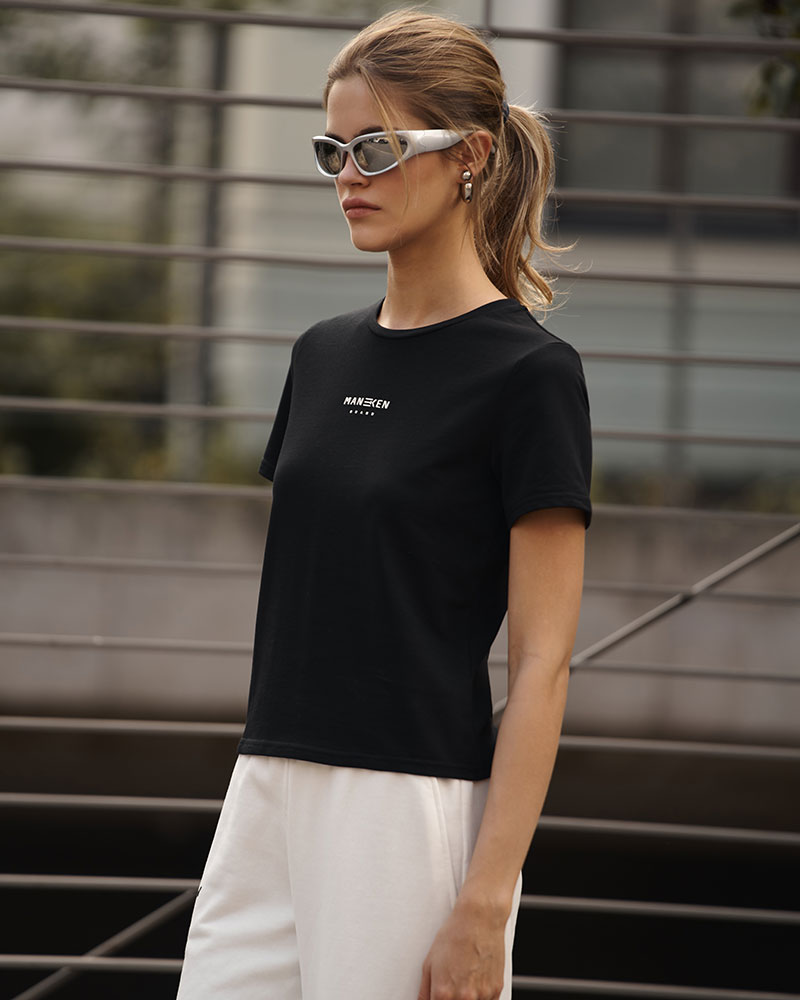 Приталенная малообъёмная укороченная по длине футболка, для создания более классических образов под объёмные низы.