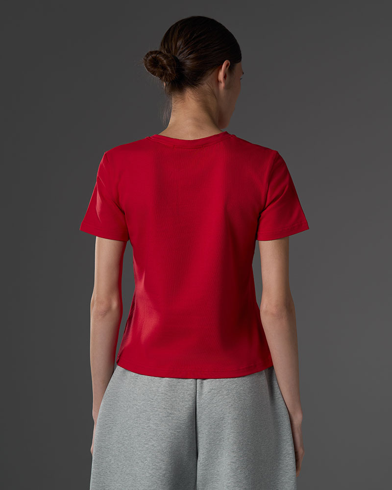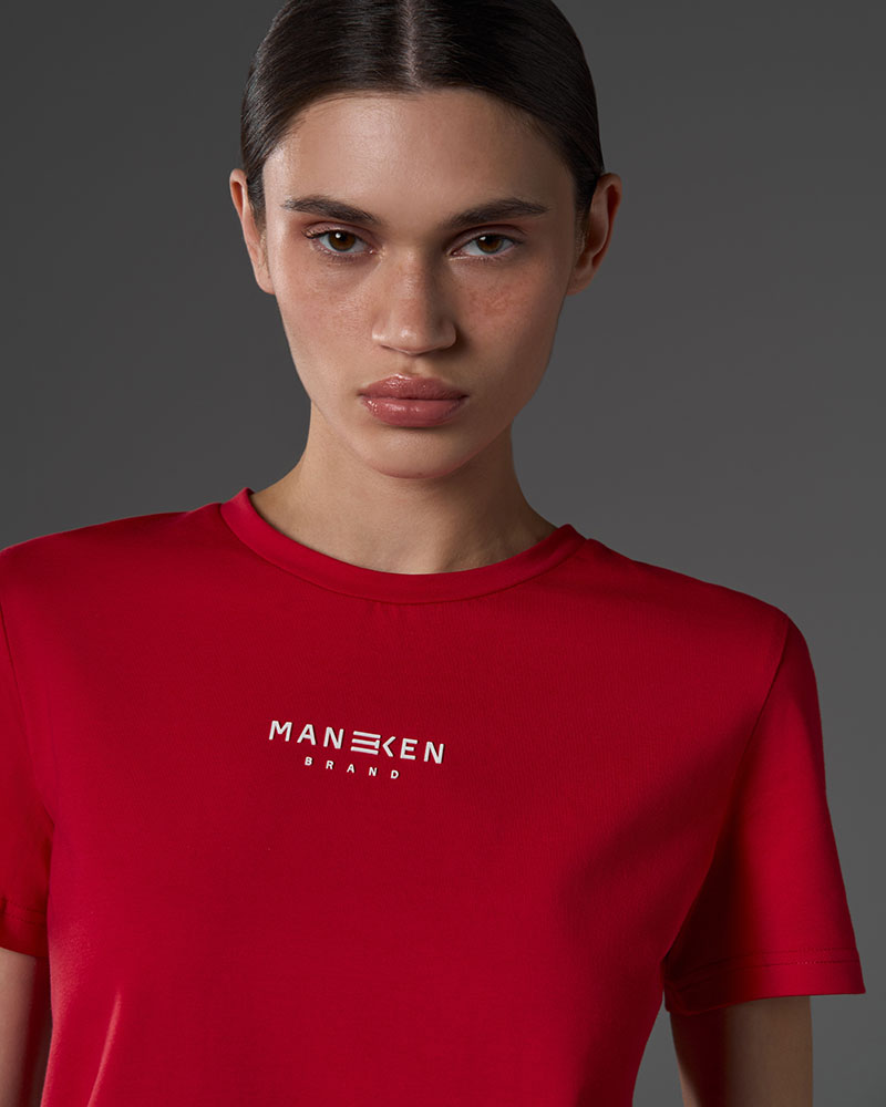 Приталенная малообъёмная укороченная по длине футболка, для создания более классических образов под объёмные низы.