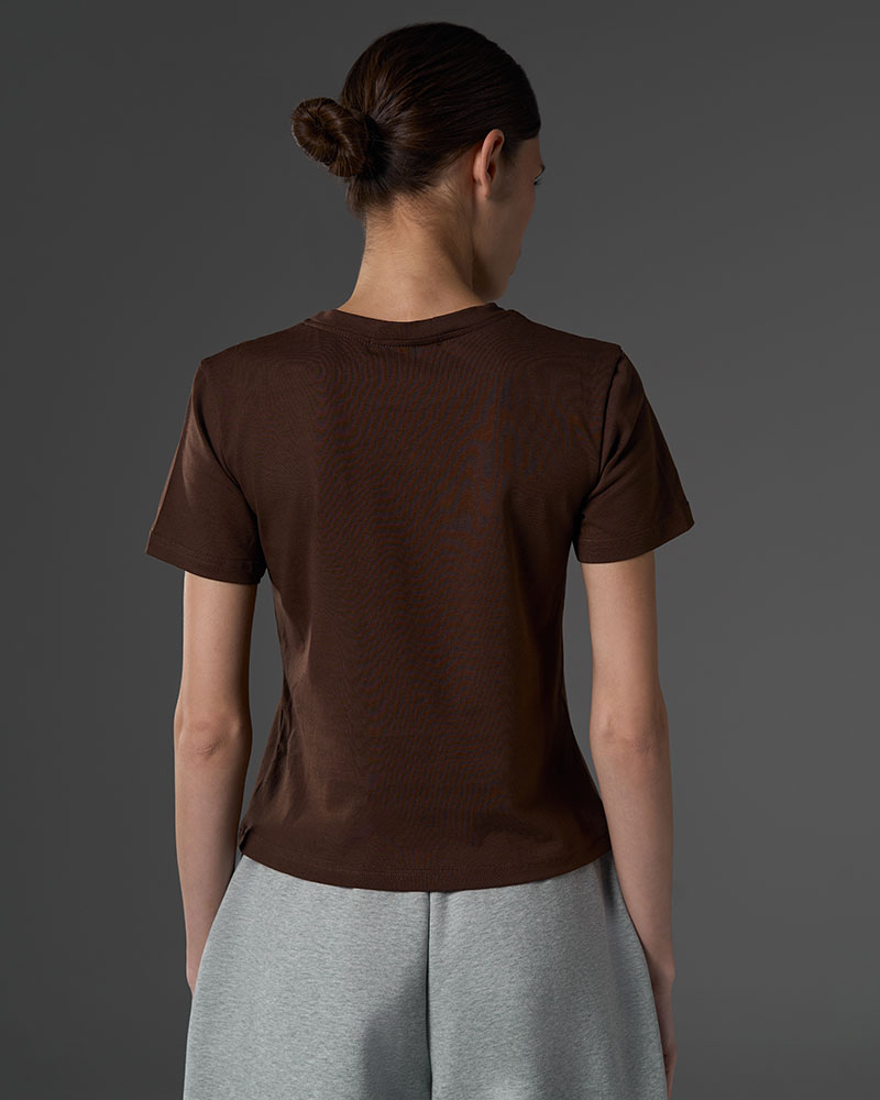 Приталенная малообъёмная укороченная по длине футболка, для создания более классических образов под объёмные низы.