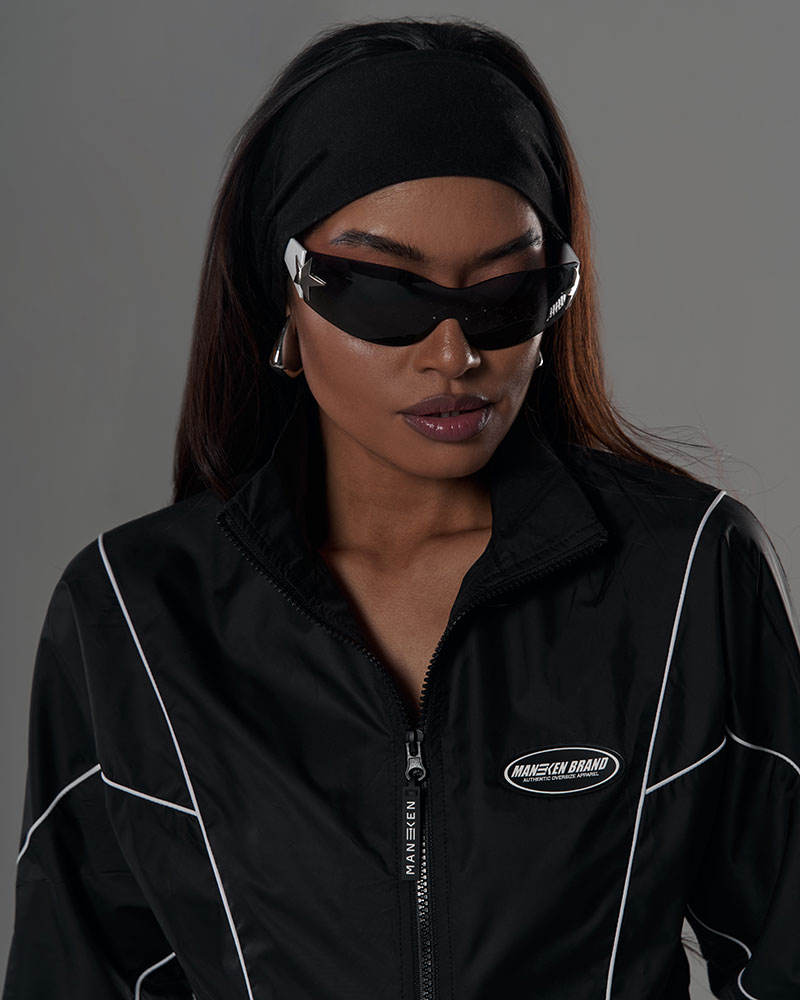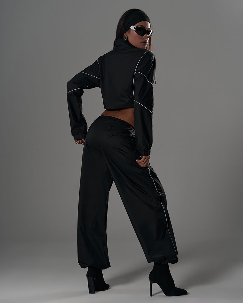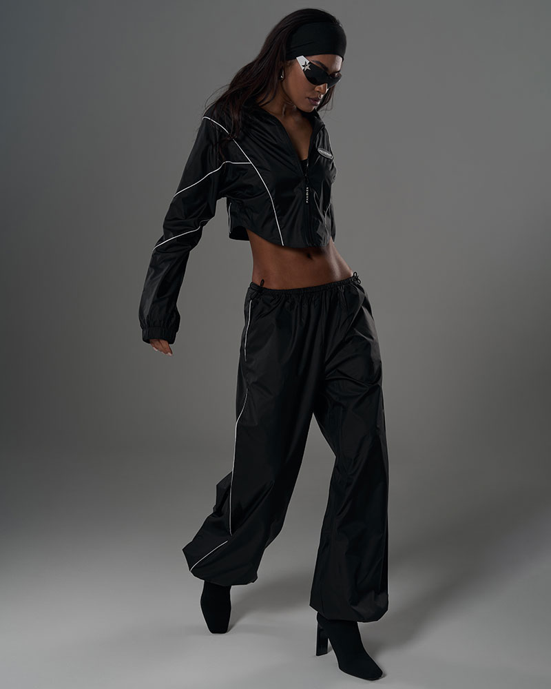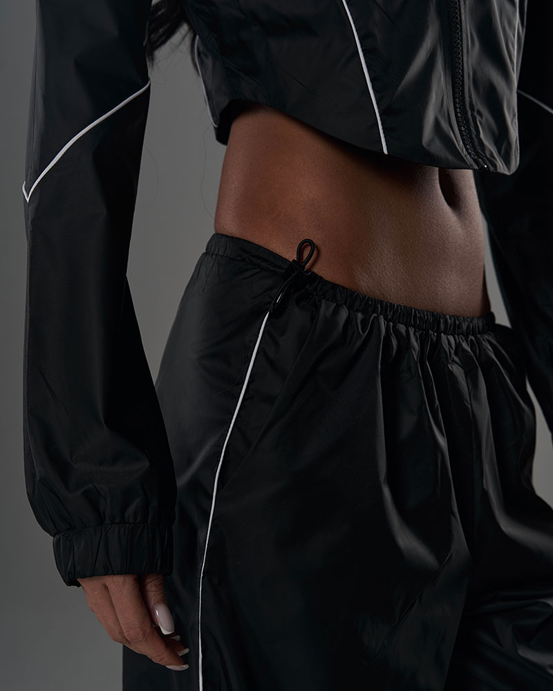 По всей ветровке в рельефах контрастный кант, подчеркивающий линии, которые визуально делают фигуру стройной.