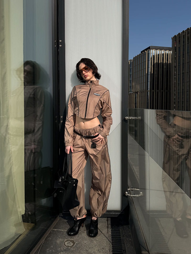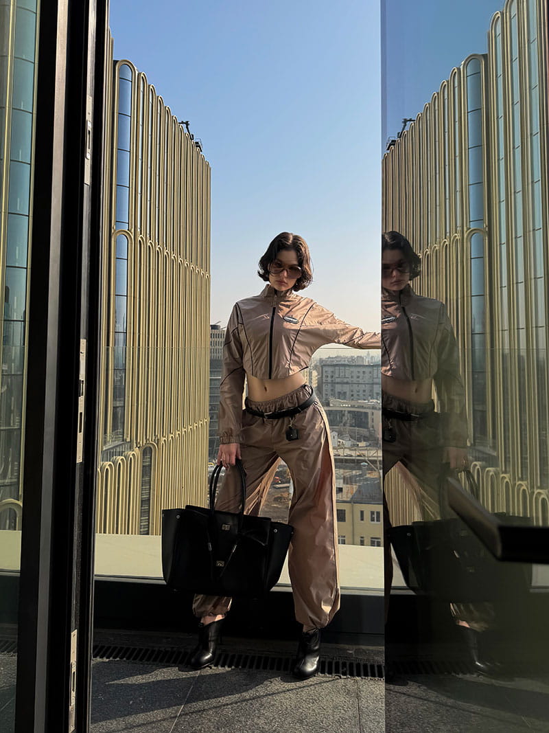 Женский костюм, вдохновленный футуристичным дизайном большого города. Состоит из укороченной ветровки с фигурным низом, напоминающим корсет. Воротник мягкая стойка. Рукав «летучая мышь» с узкой манжетой на резинке.