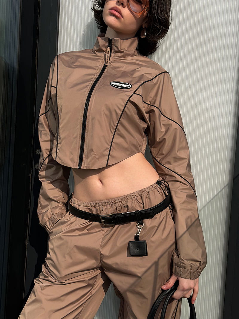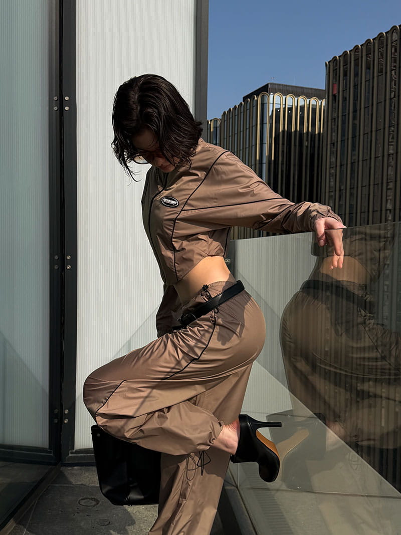 По всей ветровке в рельефах контрастный кант, подчеркивающий линии, которые визуально делают фигуру стройной.