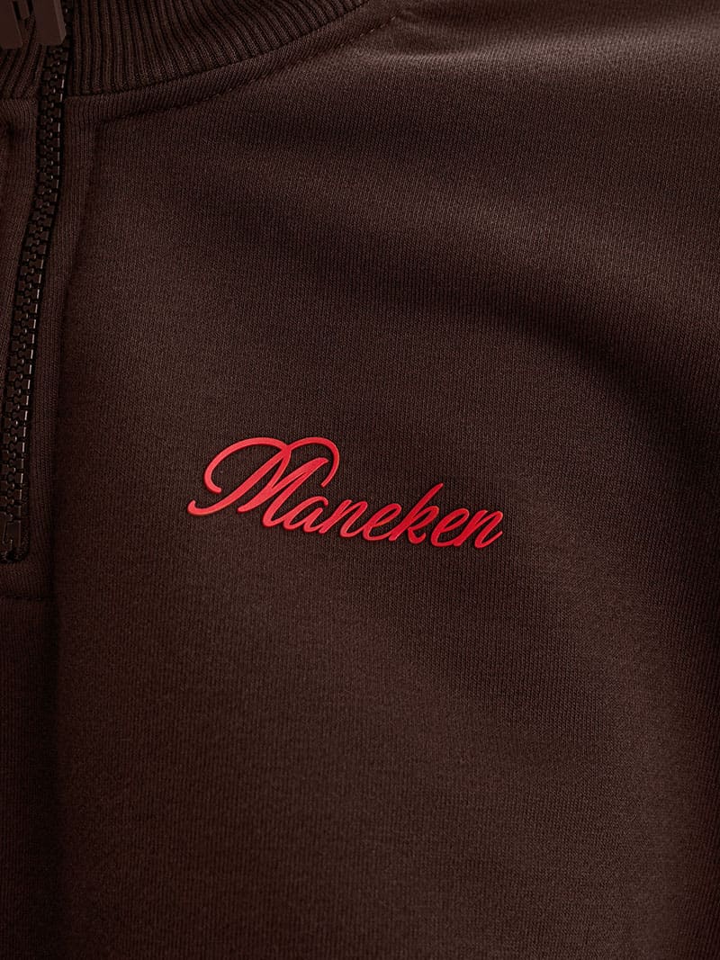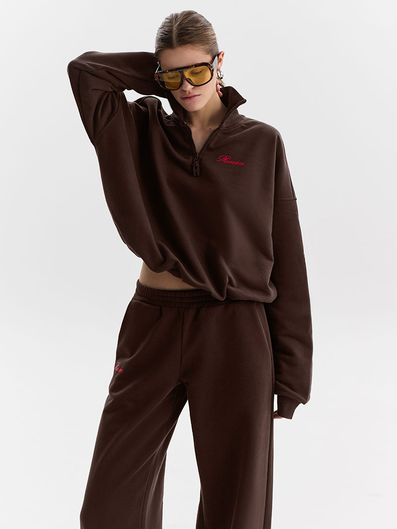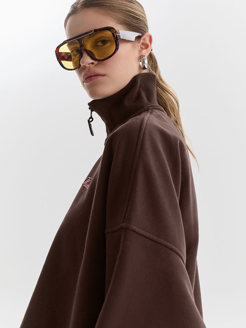 Вдохновленный олимпийками свитшот имеет воротник-стойку с короткой молнией, которая позволяет регулировать уровень комфорта по погоде, добавляет спортивный акцент и современный стиль. Завершает образ прорезиненный фирменный винтажный логотип.