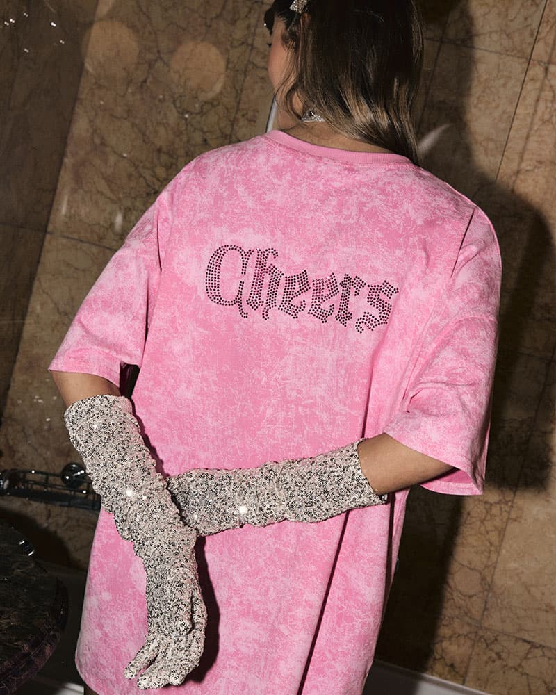 Сзади футболка украшена стразами в тон основного цвета изделия. Блестящие стразы собираются в праздничное слово "Cheers" выполненное в готическом шрифте.