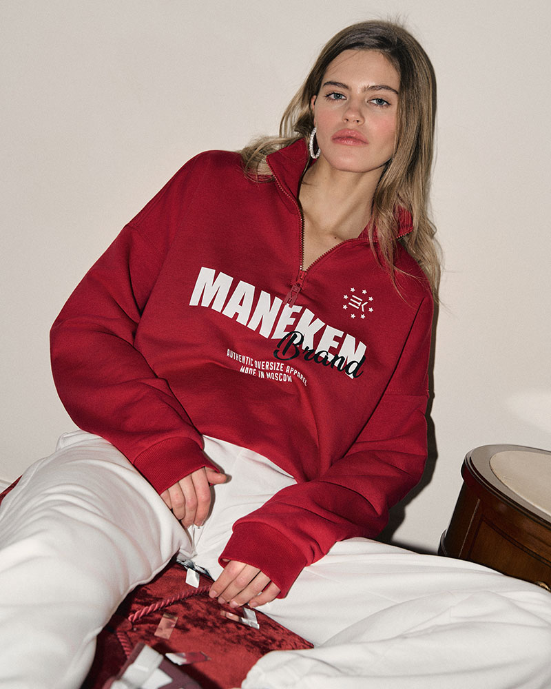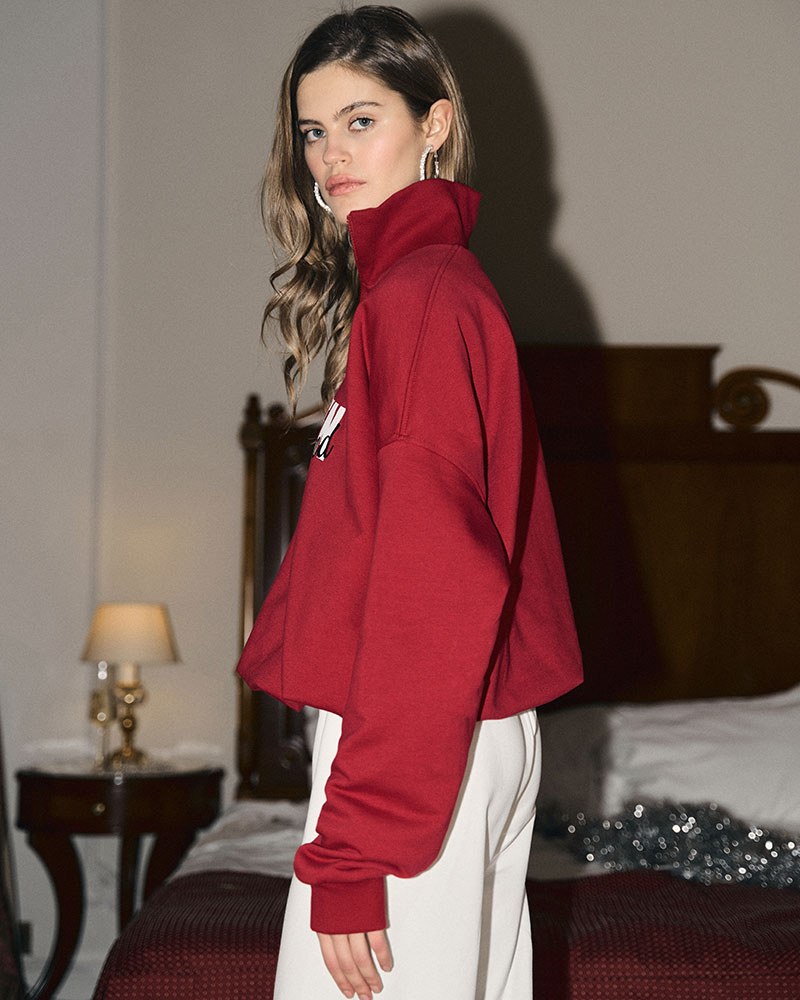 Вдохновленный олимпийками свитшот имеет воротник-стойку с короткой молнией, которая позволяет регулировать уровень комфорта по погоде, добавляет спортивный акцент и современный стиль.