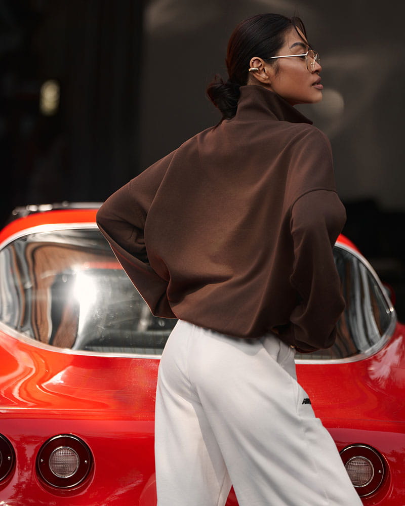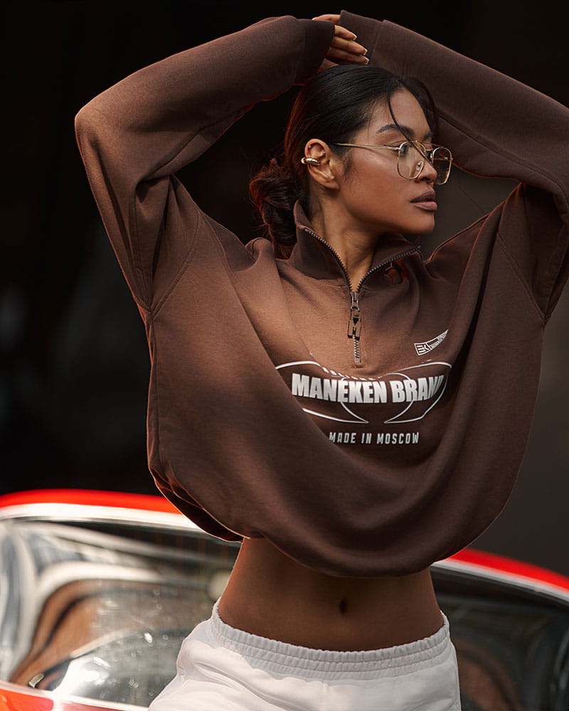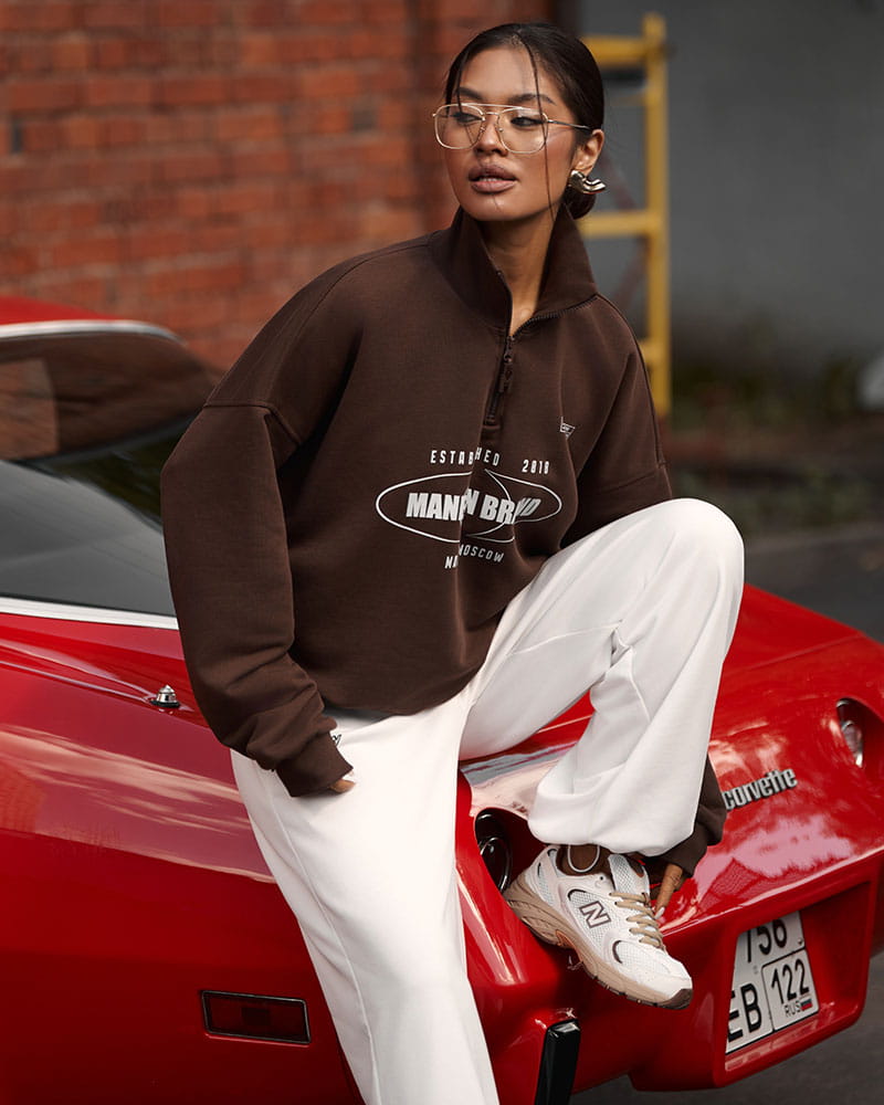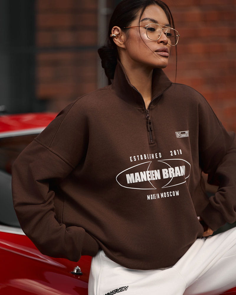 Вдохновленный олимпийками свитшот имеет воротник-стойку с короткой молнией, которая позволяет регулировать уровень комфорта по погоде, добавляет спортивный акцент и современный стиль.