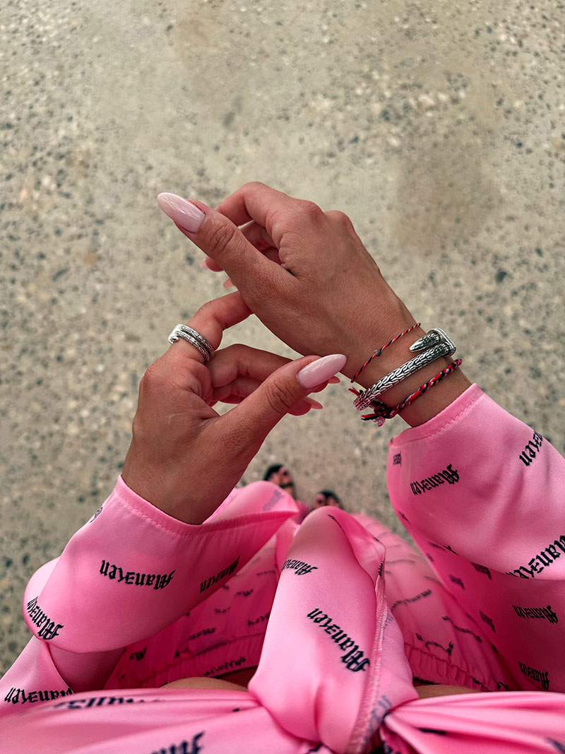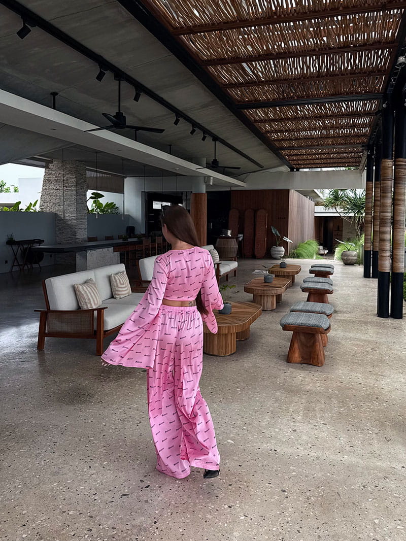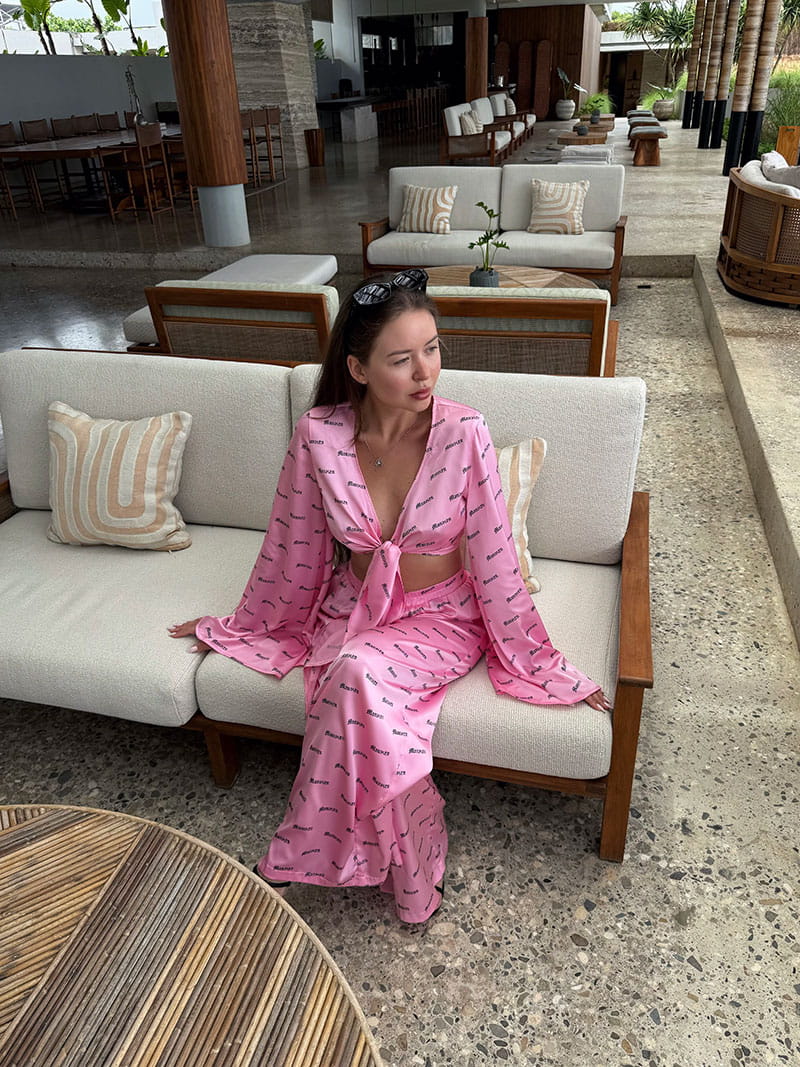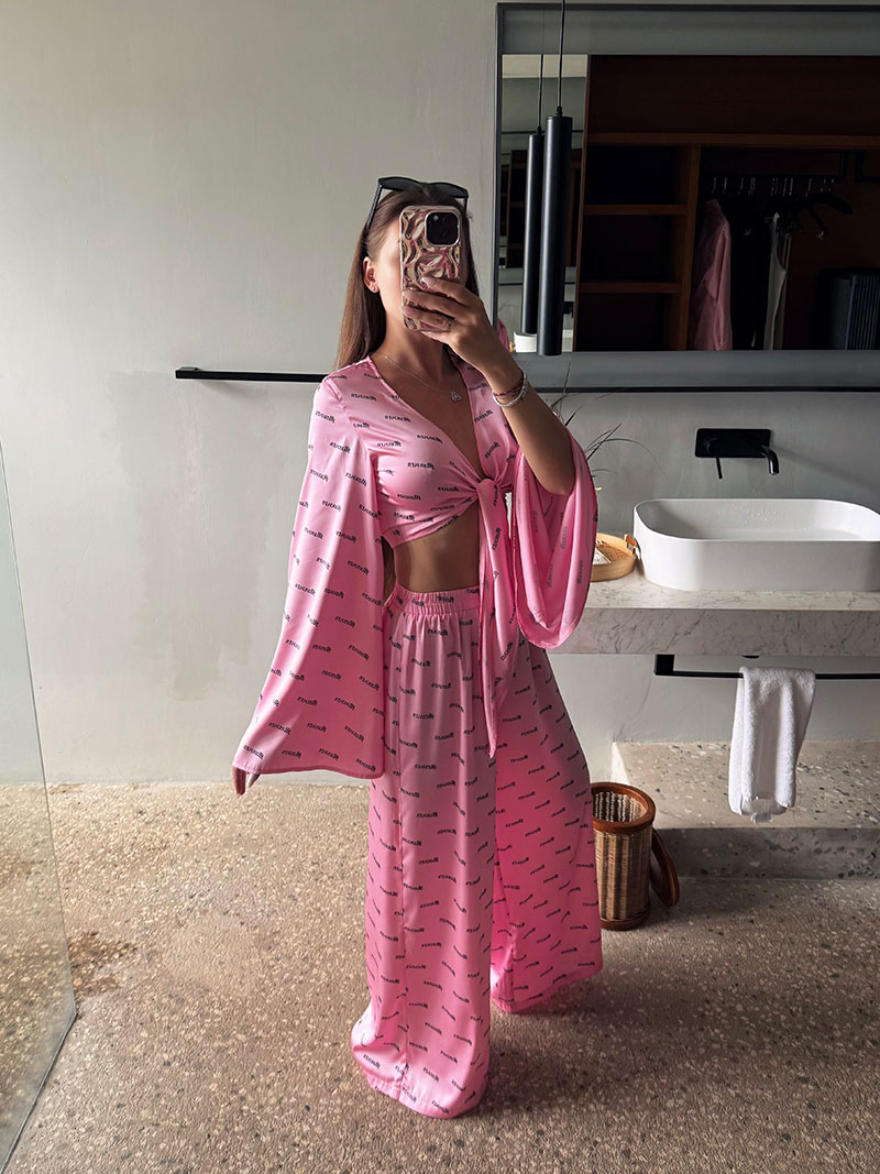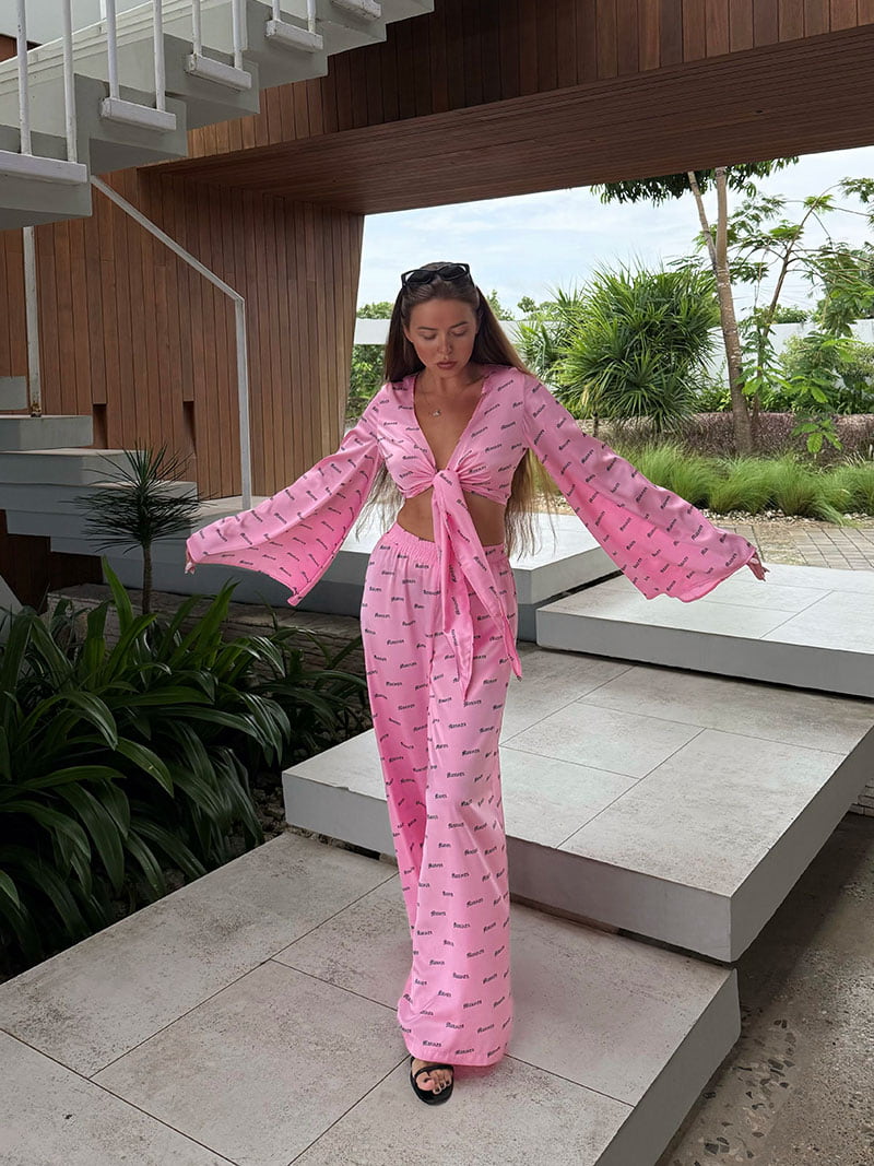Брюки выполнены в свободном струящемся силуэте, также декорированы фирменным паттерном, создавая целостность образа. Нетугая резинка на поясе обеспечивает комфортную посадку и свободу движений.