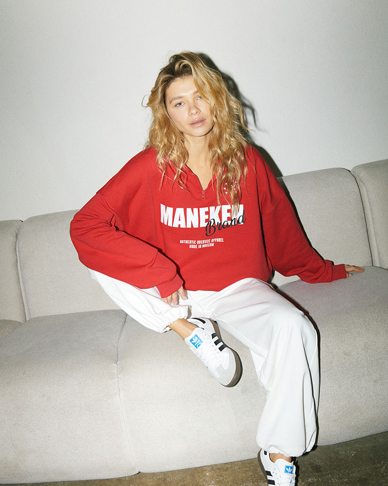Особенностью свитшота является резинка по низу, которая создает эффект "облачка" и формирует нежные, мягкие складки, добавляя образу воздушности и легкости.