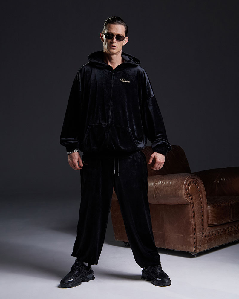 Комплект состоит из худи с молнией и брюк из мягкой бархотной ткани, даря комфортный домашний аутфит с лаконичным, но выразительным стилем.