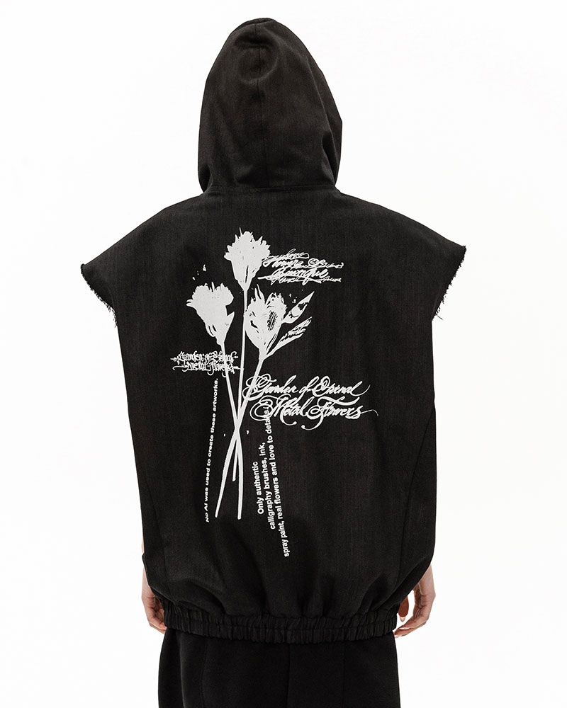 Худи-жилет с капюшоном из денима — футуристичный арт рукотворного искусства, созданный в коллаборации POKRAS LAMPAS ╳ MANEKEN BRAND под названием ALWAYS READY FOR MORE FLOWERS.