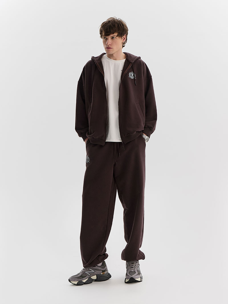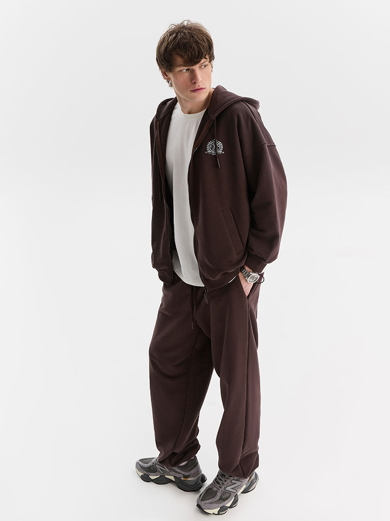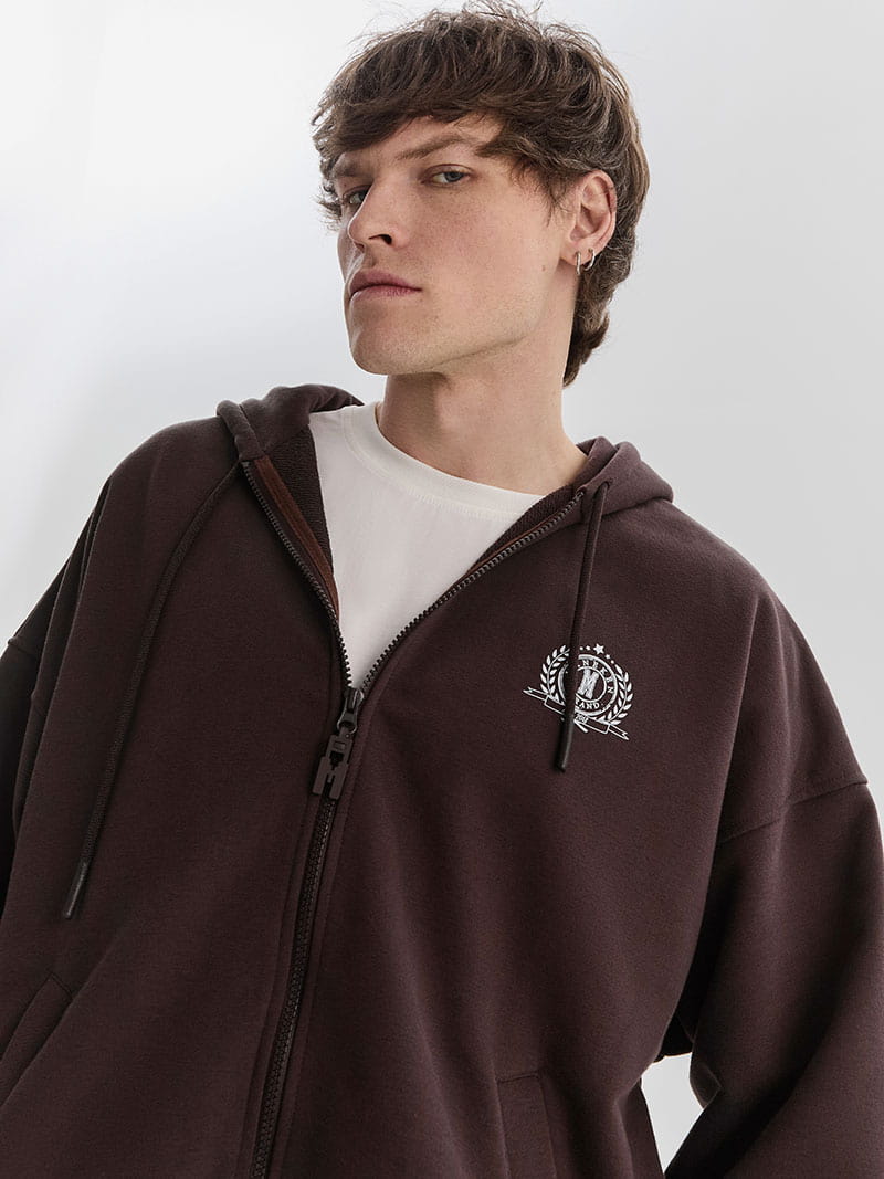 У худи есть глубокие карманы-клапаны, для мелочей. Сбоку нанесён принт «герб» в стиле old money.