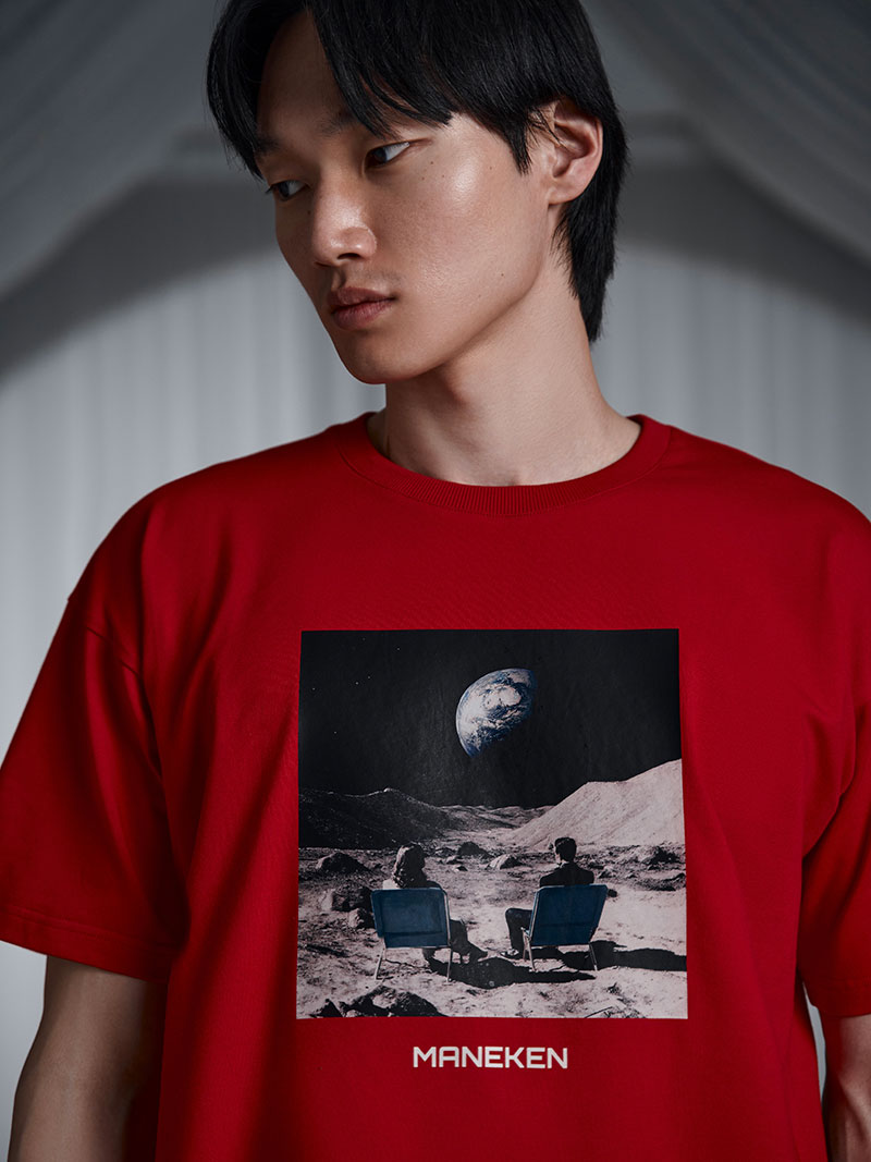 Модель умеренного объёма выполнена в насыщенном ярко-красном оттенке — энергичном, притягивающем внимание с первого взгляда. На этом выразительном фоне особенно четко раскрывается авторский принт: двое наблюдателей с Луны смотрят на Землю, зависшую в бескрайнем чёрном пространстве, усыпанном звёздами.