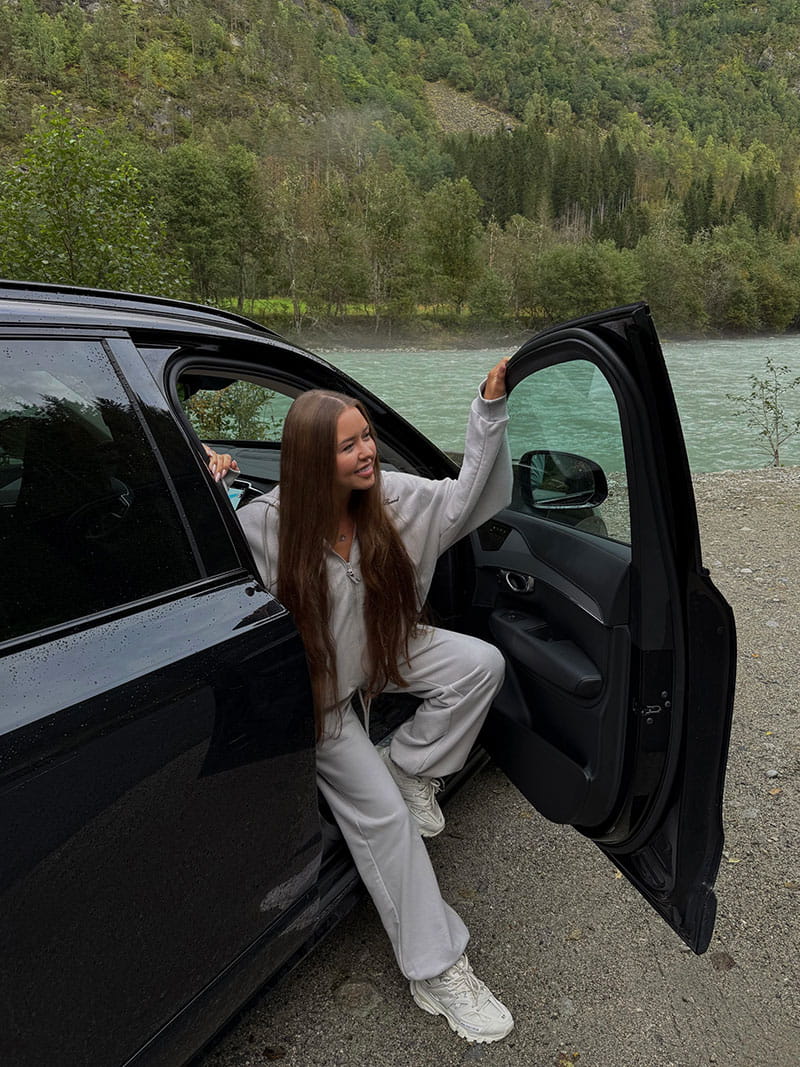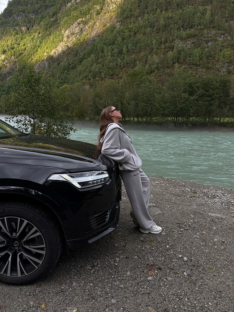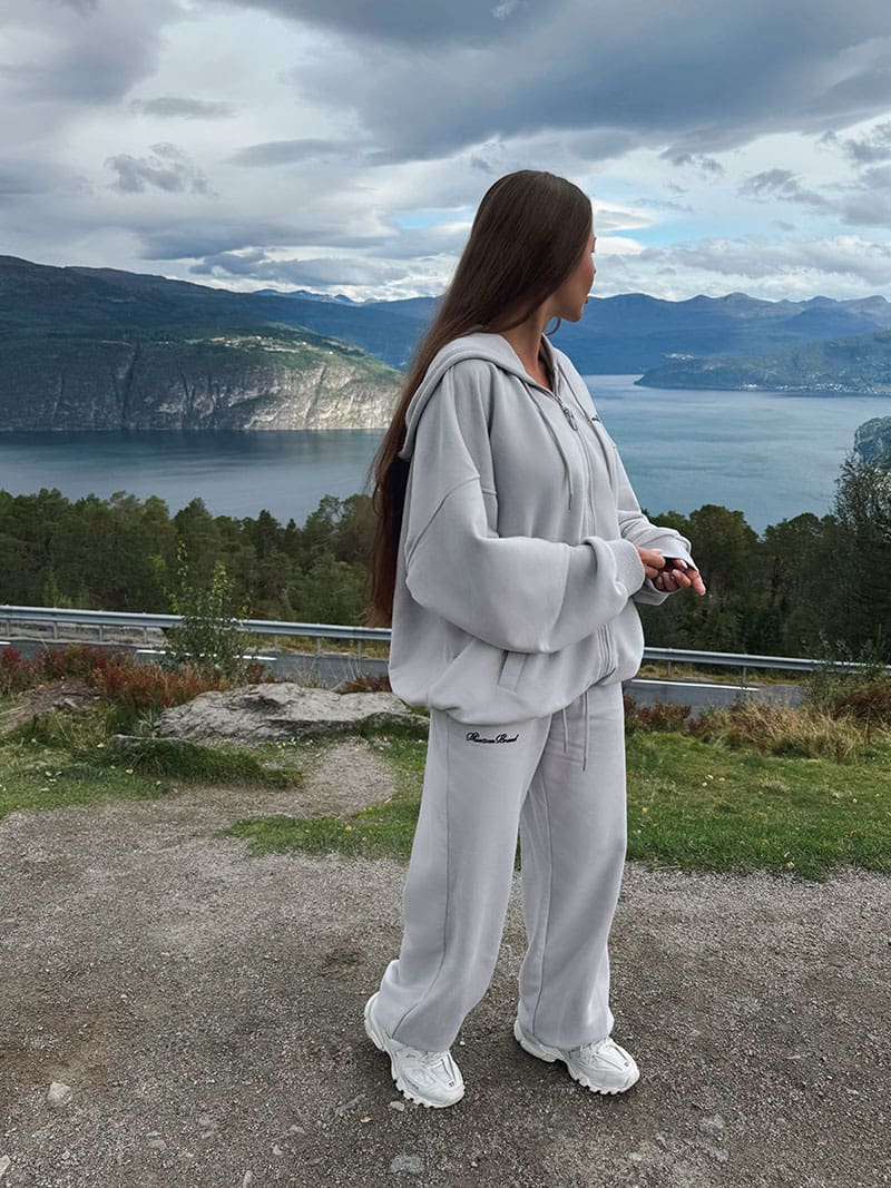 Костюм состоит из oversize худи на молнии и свободных брюк. Выполнен из мягкого велюрового «пич» материала с варёным эффектом.