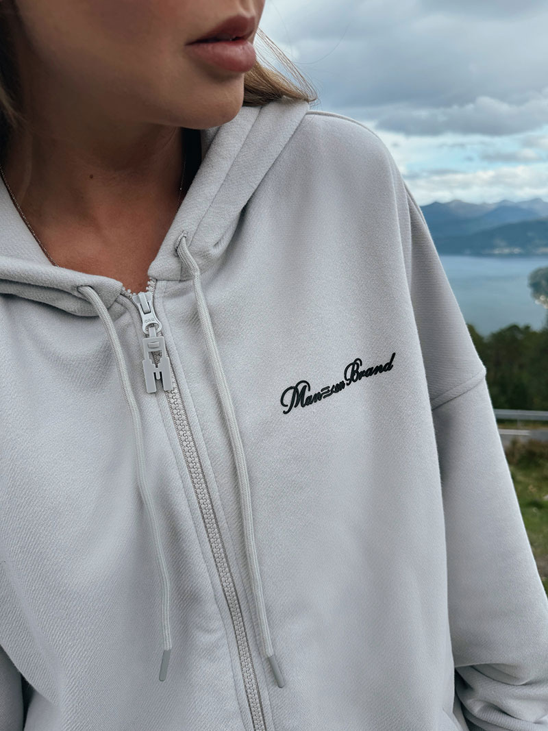 Молния имеет фирменный прорезиненный пуллер в форме «М». По низу худи имеются фиксаторы и резинка, что позволяет затянуть и сделать объёмный кроп-худи или увеличить сборку по низу.