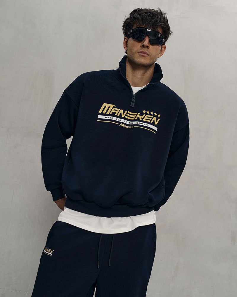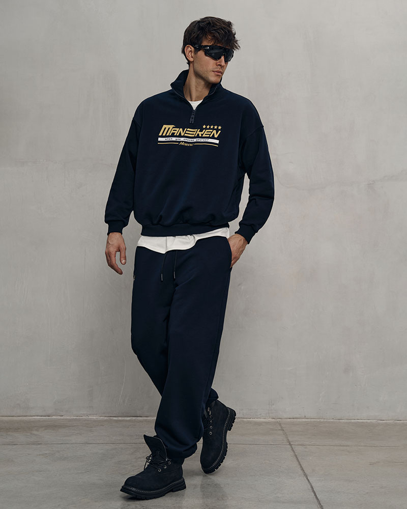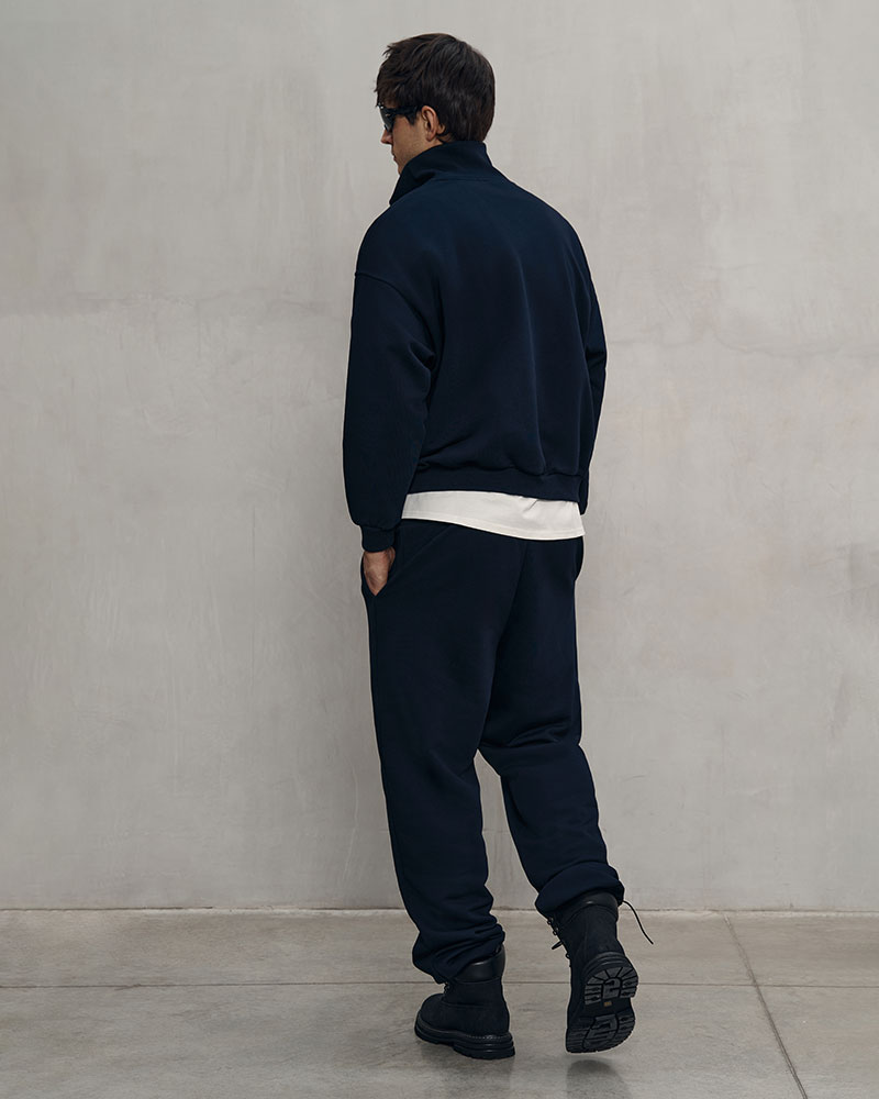 Мужской костюм из мягкого футера — это сочетание уюта, стиля и функциональности. Он состоит из тройера и свободных брюк на узком поясе со шнурками, создавая идеальный баланс между спортивной эстетикой и повседневной элегантностью.