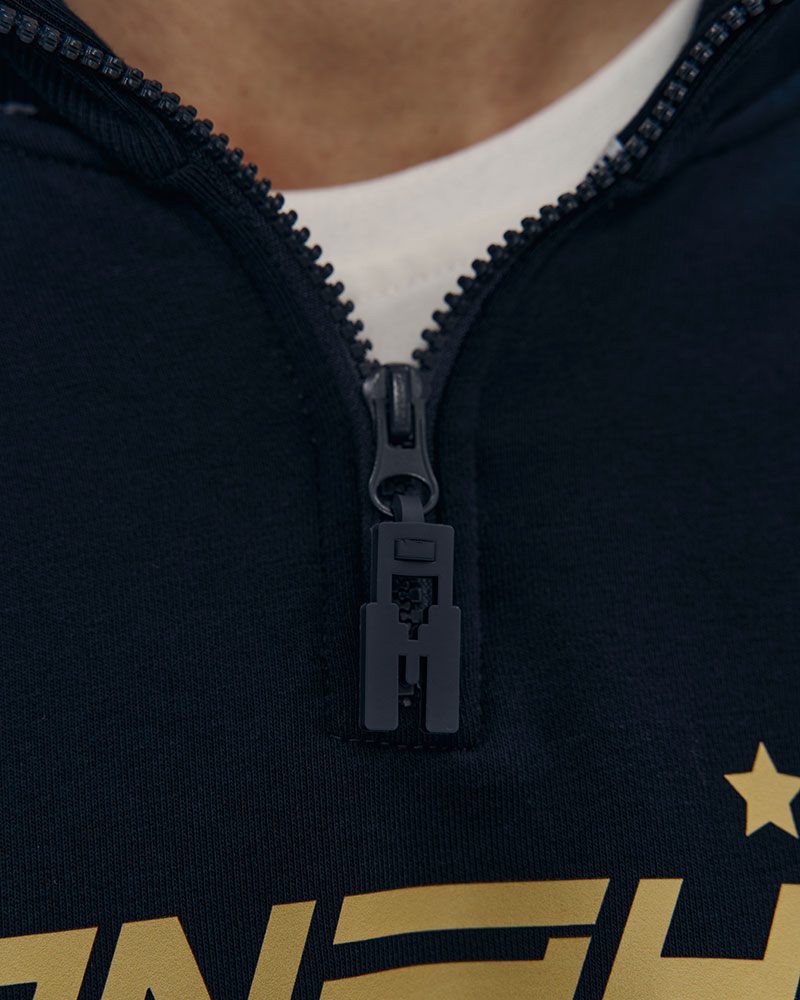 Классический тройер с воротником-стойкой на молнии — практичное решение, которое позволяет регулировать уровень комфорта в зависимости от погоды. Отличительной деталью тройера является ретро принт, отражающий гармоничное сочетание современности и стиля 70-х.