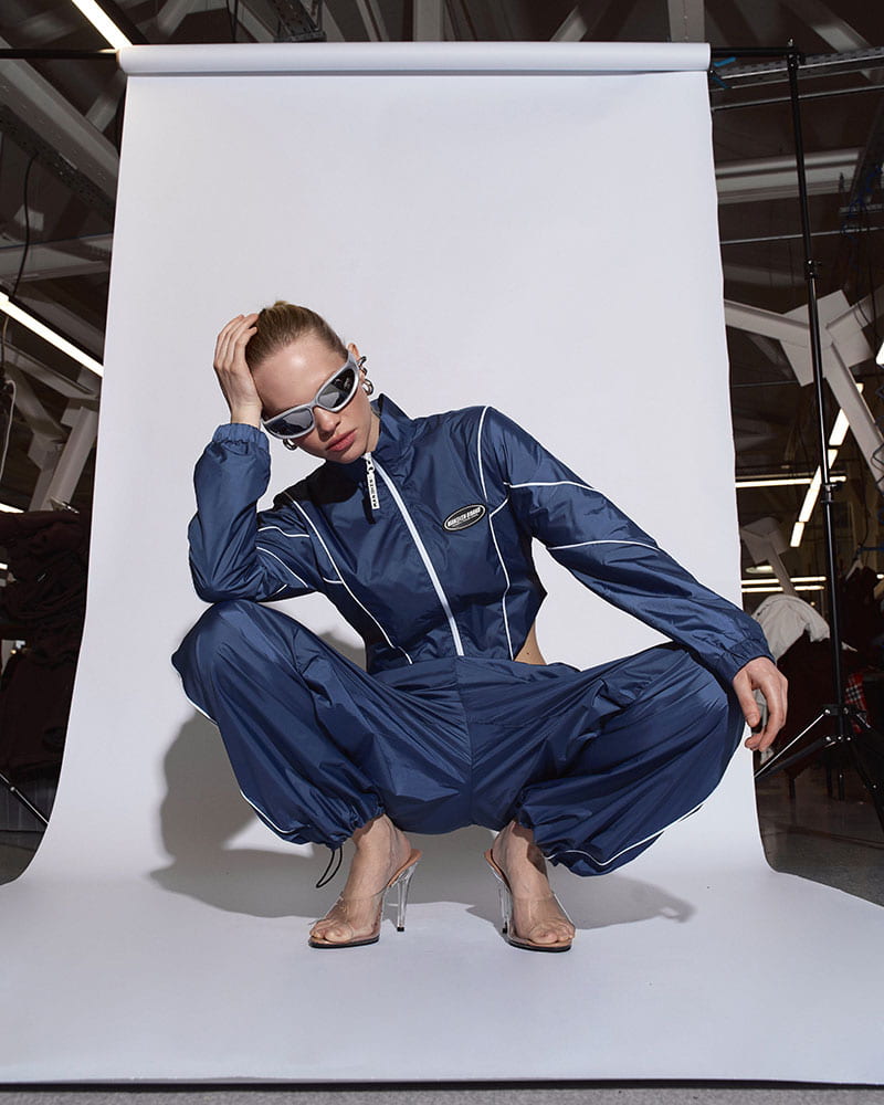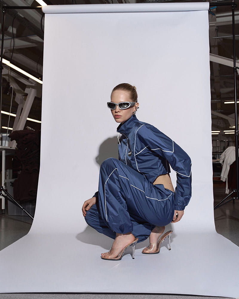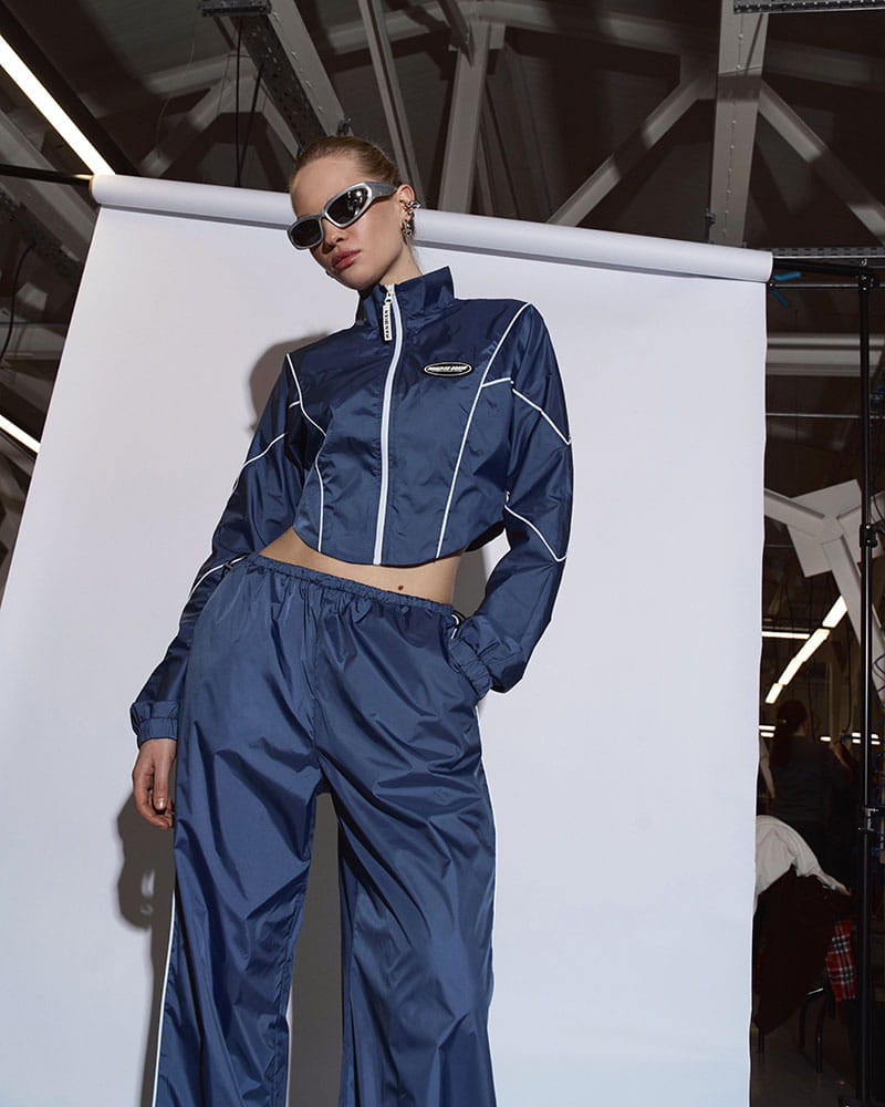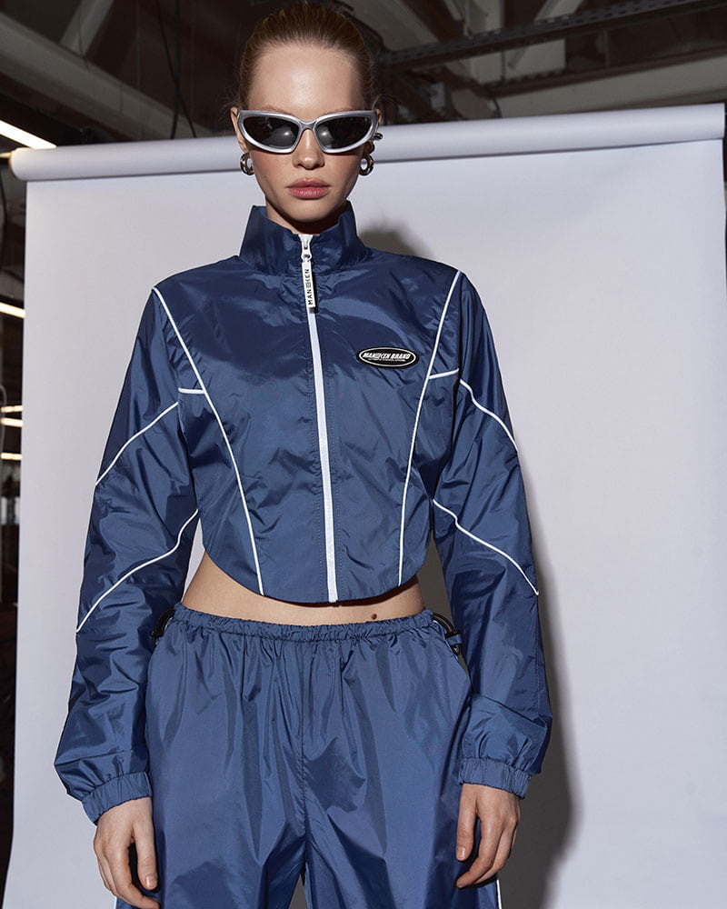 По всей ветровке в рельефах контрастный кант, подчеркивающий линии, которые визуально делают фигуру стройной.