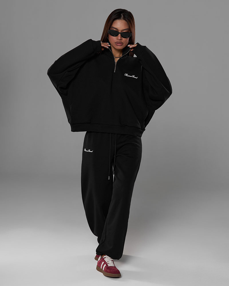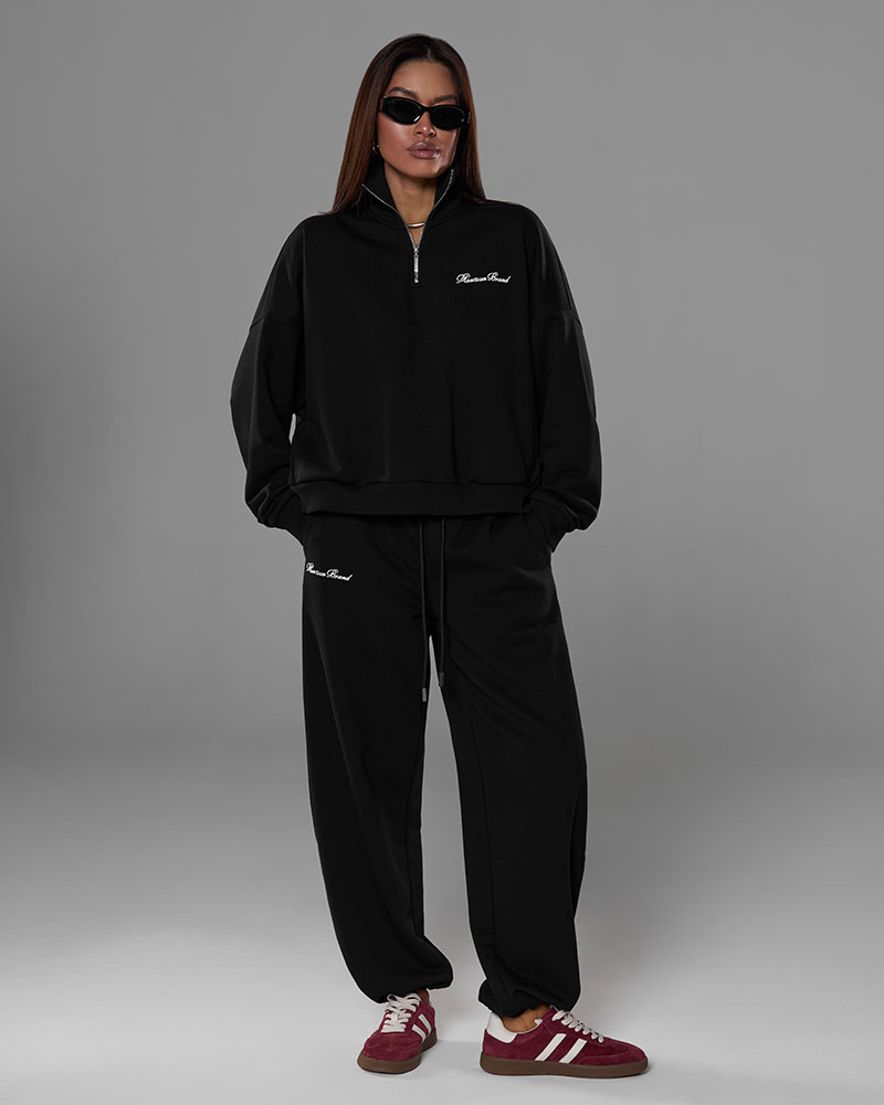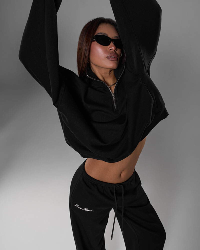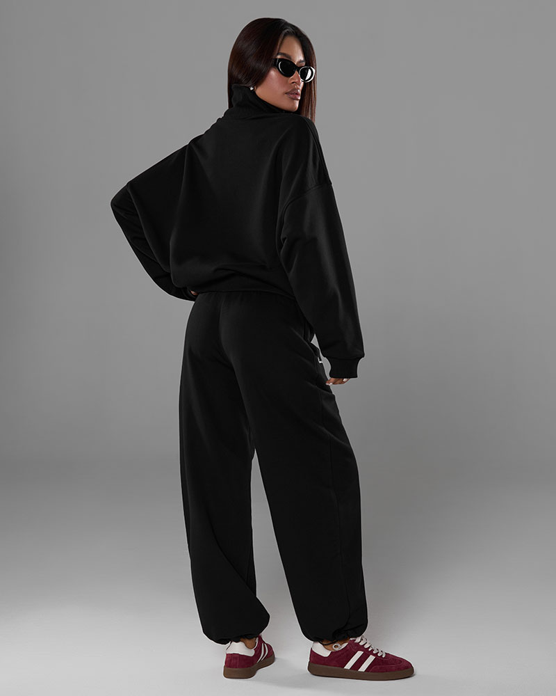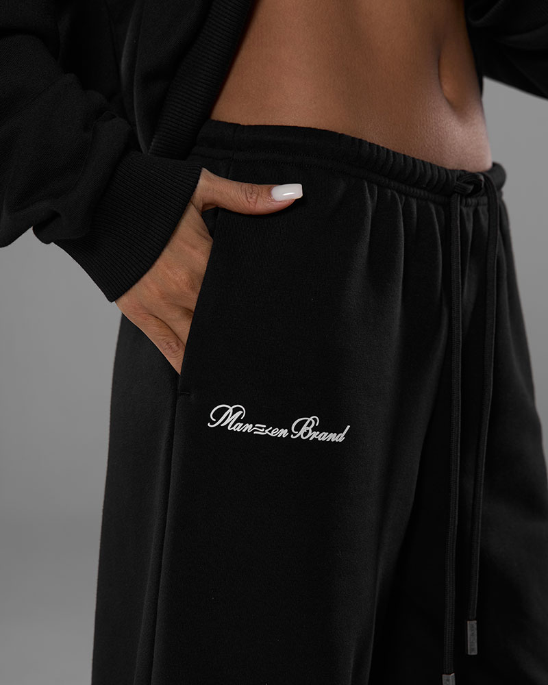 Он состоит из тройера и свободных брюк на узком поясе со шнурками, создавая идеальный баланс между спортивной эстетикой и повседневной элегантностью.