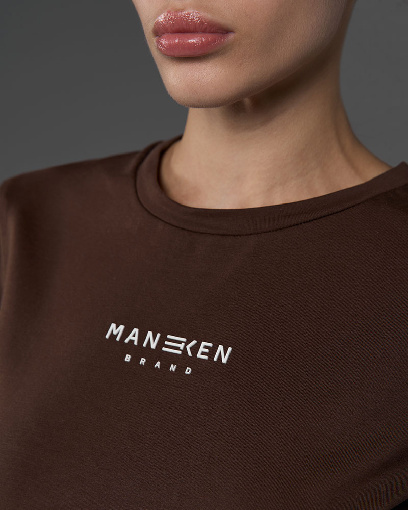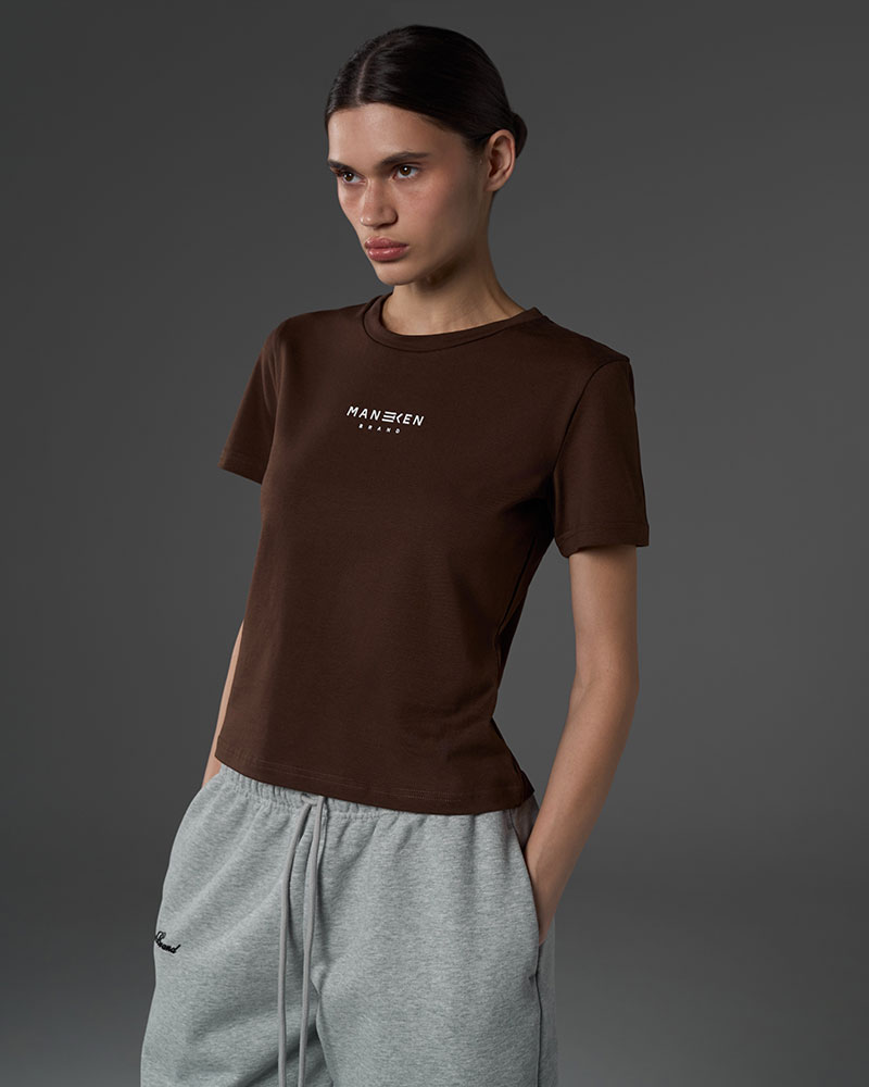 Приталенная малообъёмная укороченная по длине футболка, для создания более классических образов под объёмные низы.