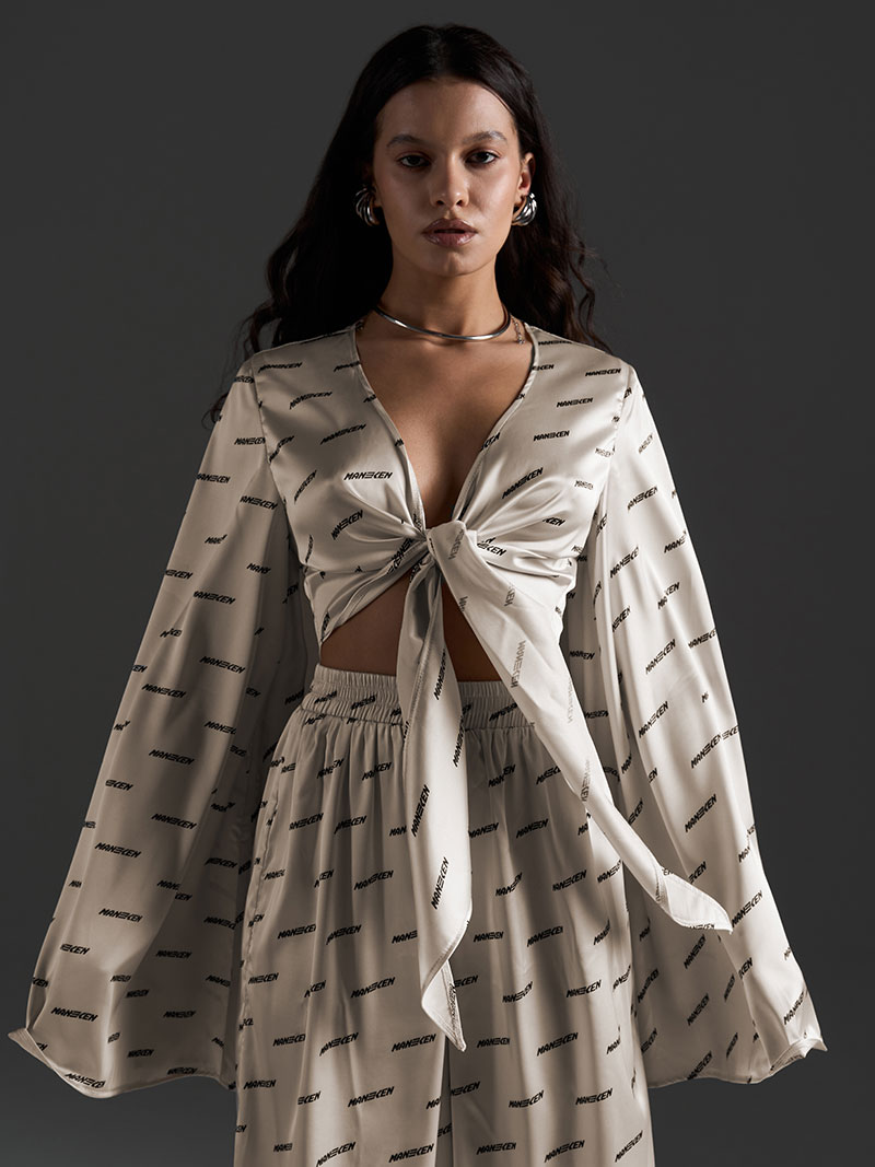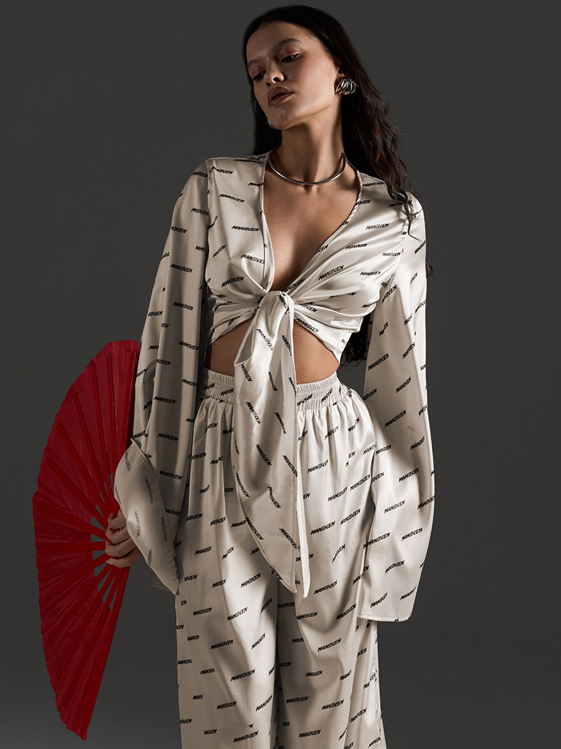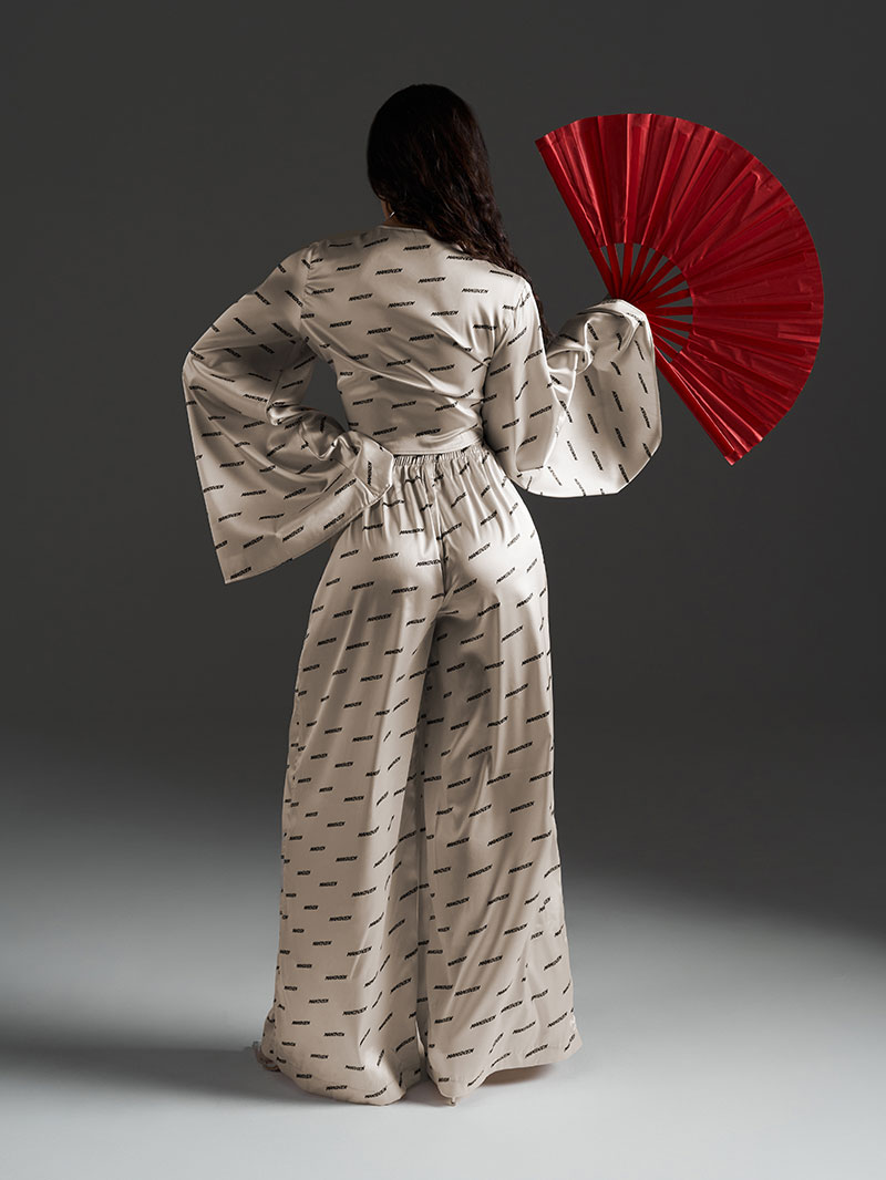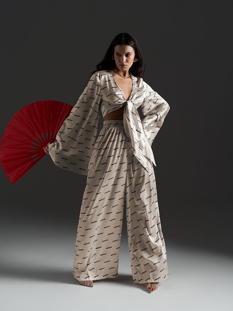 Брюки выполнены в свободном струящемся силуэте, также декорированы фирменным паттерном, создавая целостность образа. Нетугая резинка на поясе обеспечивает комфортную посадку и свободу движений.