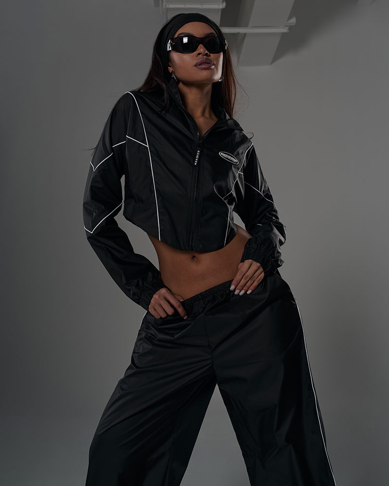 По всей ветровке в рельефах контрастный кант, подчеркивающий линии, которые визуально делают фигуру стройной.