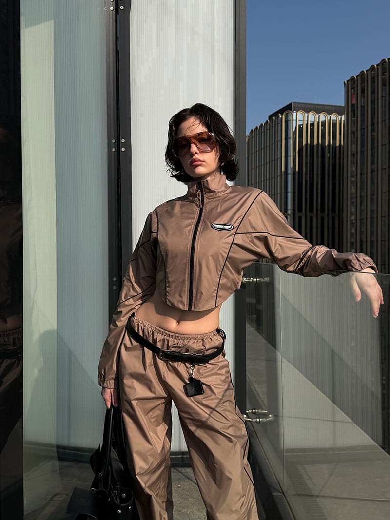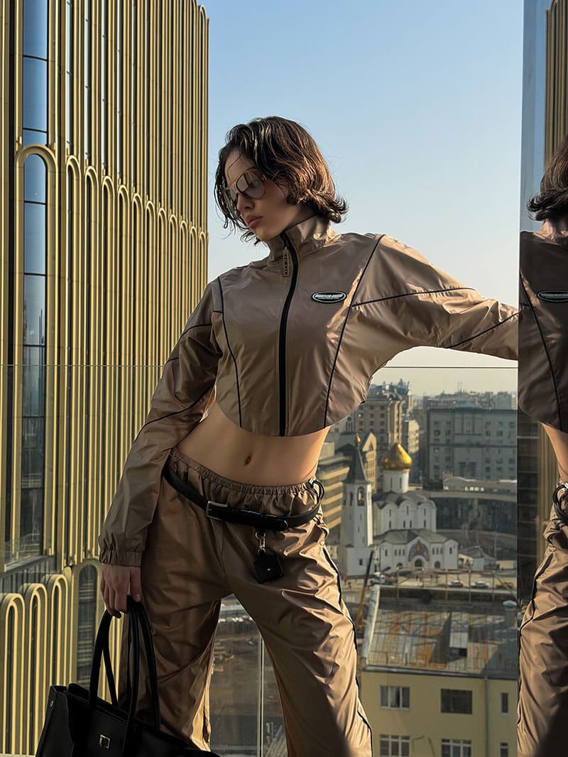 Женский костюм, вдохновленный футуристичным дизайном большого города. Состоит из укороченной ветровки с фигурным низом, напоминающим корсет. Воротник мягкая стойка. Рукав «летучая мышь» с узкой манжетой на резинке.