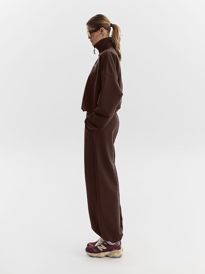 Брюки на низкой посадке с широкими брючинами. По низу имеются фиксаторы и тонкая резинка, что позволяет затягивать брючины и создавать удобный и комфортный образ в зависимости от настроения и желаемого силуэта.