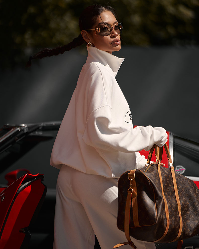 Особенностью свитшота является резинка по низу, которая создает эффект "облачка" и формирует нежные, мягкие складки, добавляя образу воздушности и легкости.
